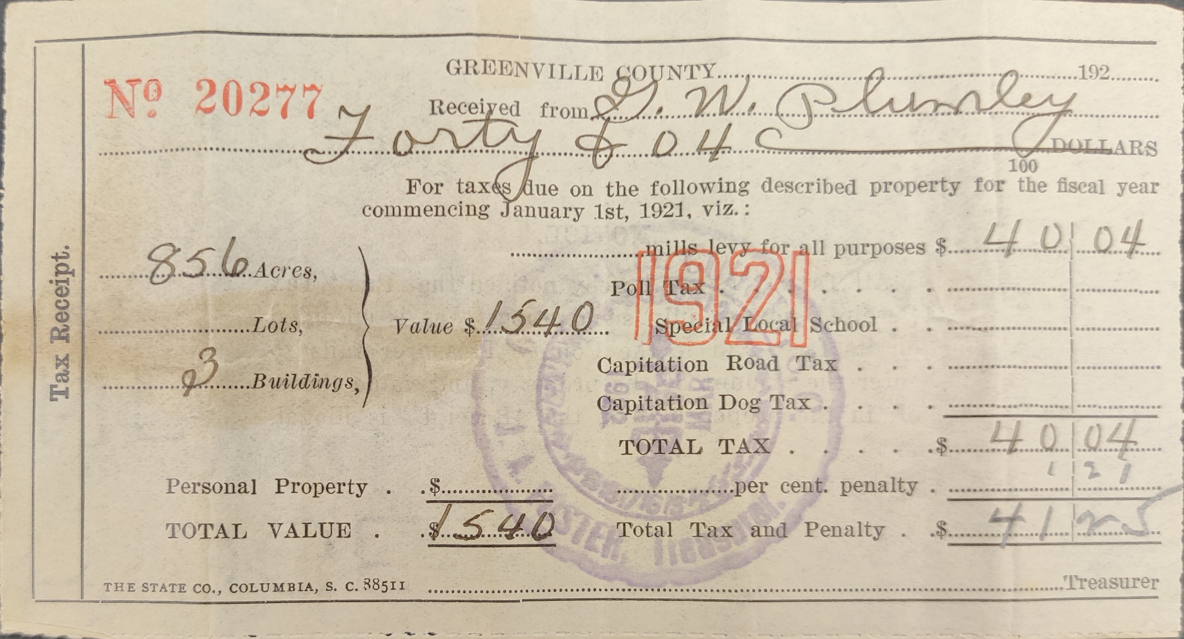 - Greenville County tax receipt: received of G. W. Plumley $41.25, of which $40.04 is tax levied on 856 acres with 3 buildings valued at $1,540, plus penalty of $1.21.