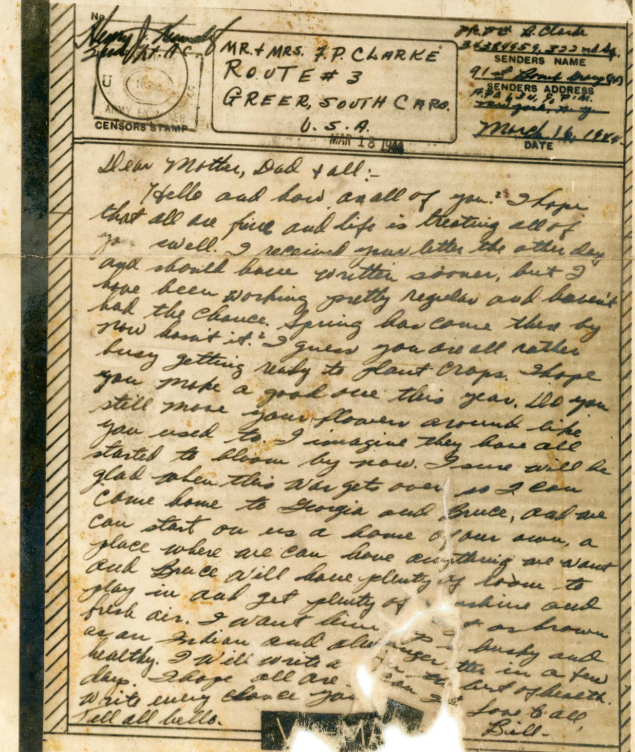 Hello and how are all of you? I hope that all are fine and life is treating all of you well. I received your letter the other day and should have written sooner, but I have been working pretty regular and haven't had the chance. Spring has come there by now hasn't it? I guess you are all rather busy getting ready to plant crops. I hope you make a good one this year. (Illegible) you still move your flowers around like you used to. I imagine they have all started to bloom by now. I sure will be glad when the war gets over so I can come home to Georgia and Bruce, and we can start on a home of our own, a place where we can have anything we want and Bruce will have plenty of room to play in and get plenty of sunshine and fresh air. I want him to (illegible) as brown as an Indian and always (illegible) bushy and healthy. I will write a longer letter in a few days. I hope all are in the best of health. Write every chance you can get. Tell all (bells?)