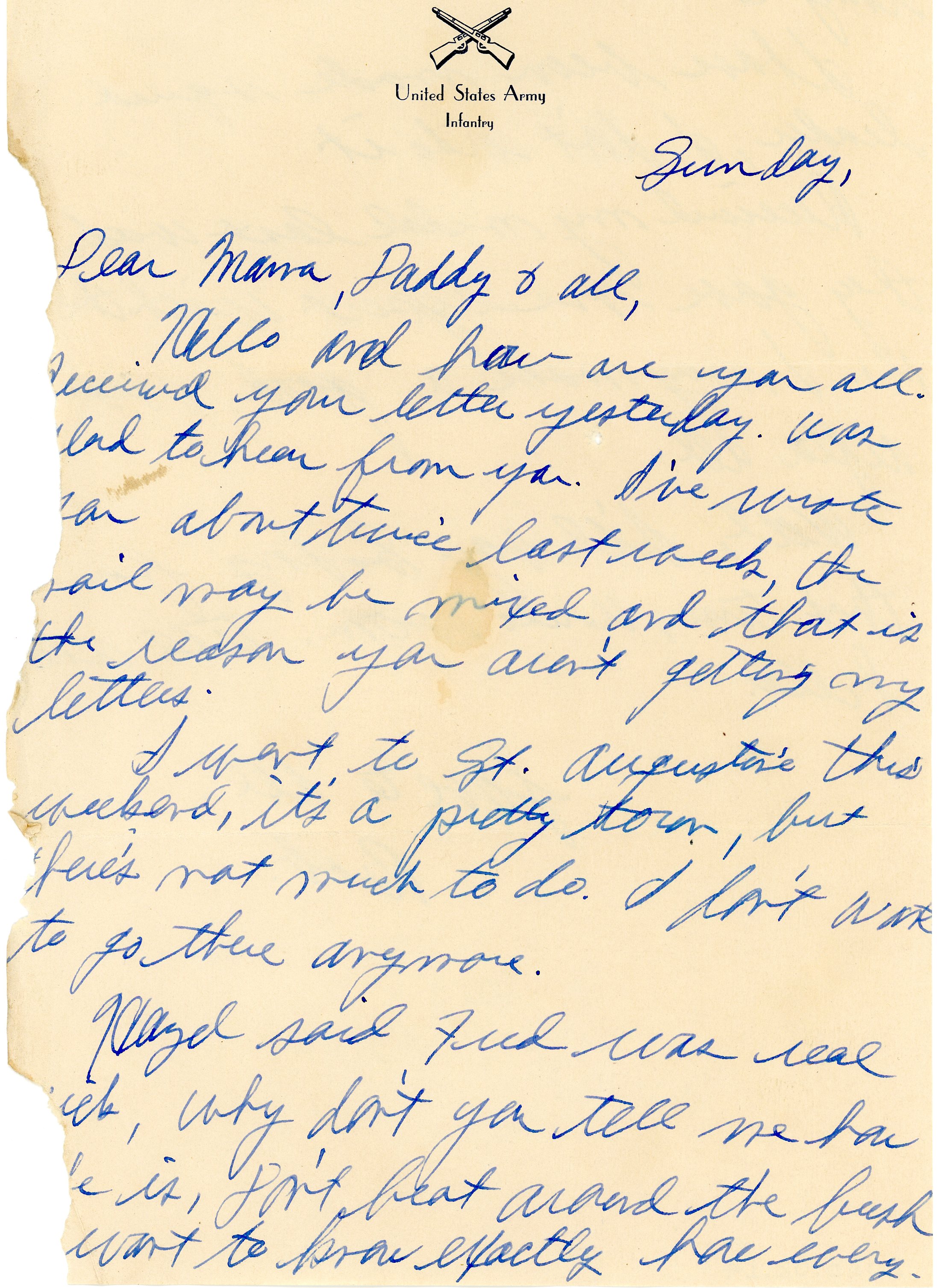 Hello and how are you all. [tear] received your letter yesterday. Was [tear] glad to hear from you. I've wrote [tear] you about three last weeks, the mail may be mixed and that is the reason you aren't getting any letters.