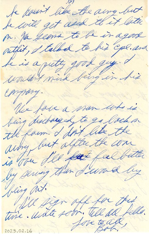 Us have a man who is being discharged to go back on the farm. I don't like the army, but after the war is over I'll feel better by serving than I would by being out.