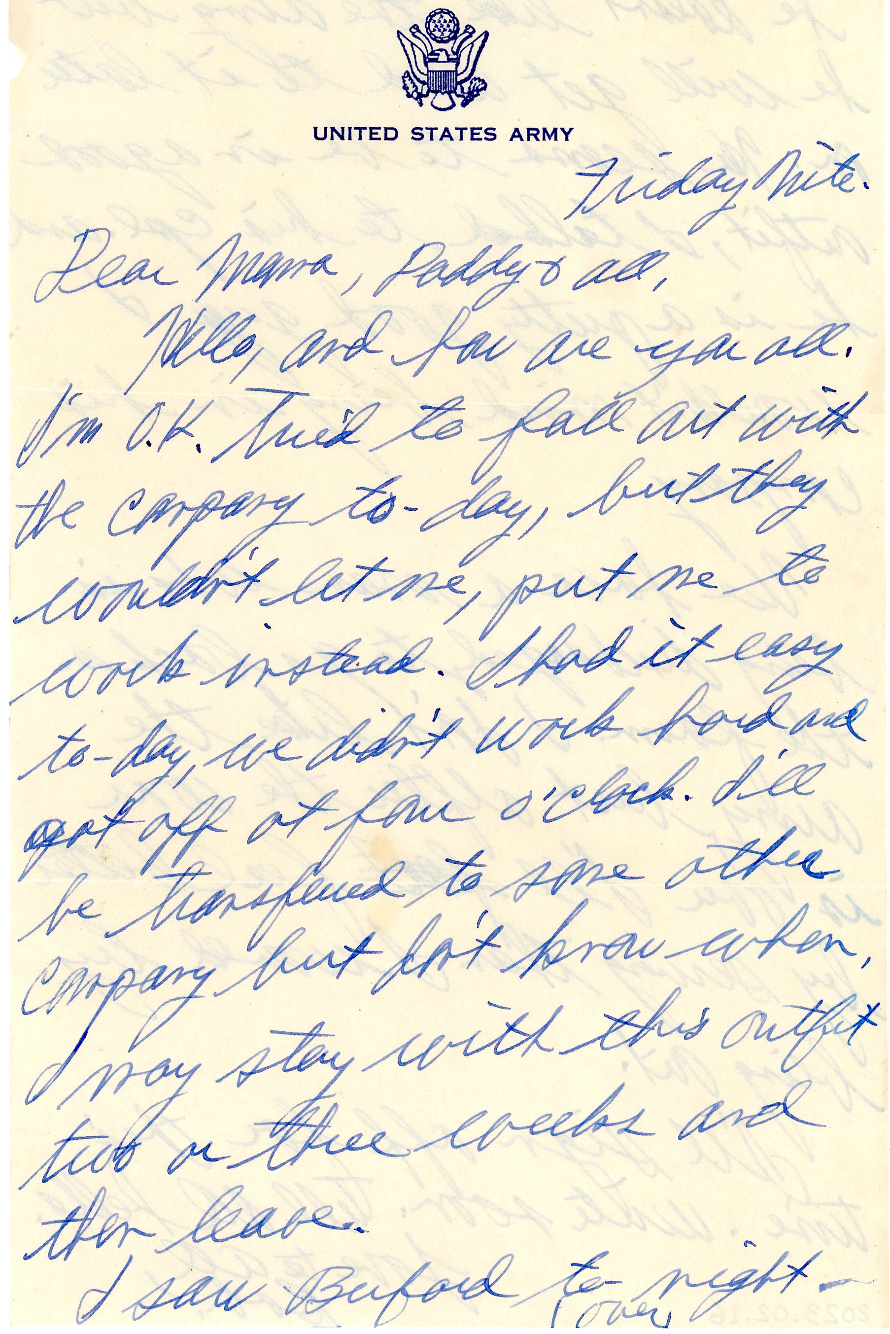 I saw Buford to-night [intelligible] he doesn't like the army but he will get used to it later on. He seems to be in a good outfit, I talked to his cap. and he is a pretty good guy. I wouldn't mind being in his company.
