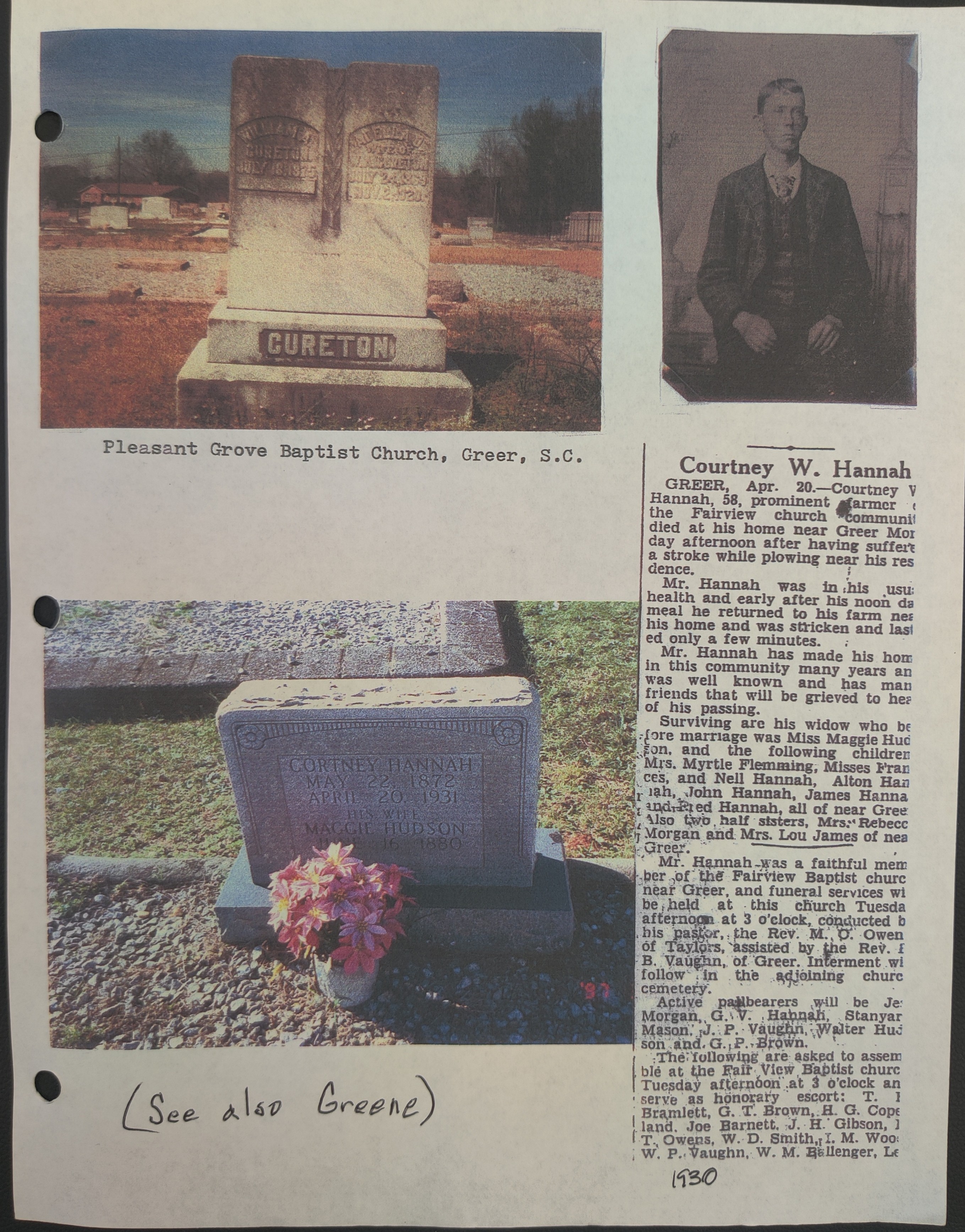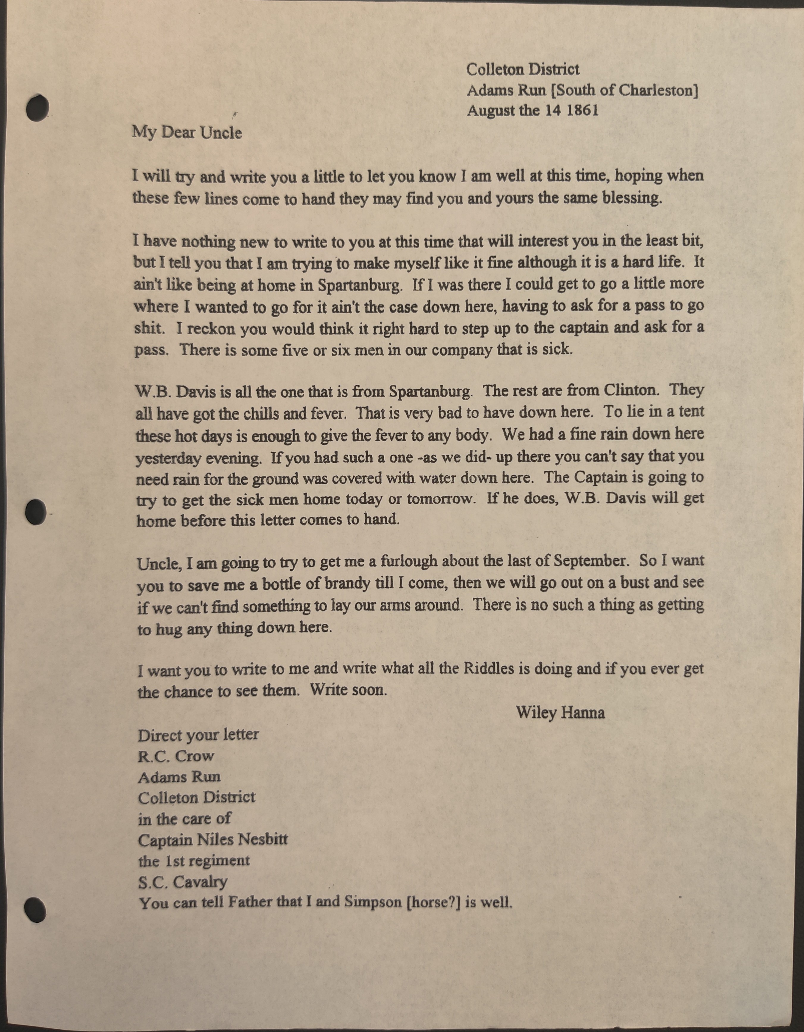 - The obituary for Courtney Hannah (May 22, 1872-April 20, 1931) includes the names of his wife (Maggie Hudson Hannah), daughters (Myrtle Hannah Flemming, Frances, and Nell Hannah), and sons (Alton, John, James, and Fred Hannah). The other obituaries include similar family information. The transcribed letter was authored by Wiley Hanna on August 14, 1861 during his time among the 1st regiment of the S. C. Cavalry. Hanna details his experience as the company stayed at Adams Run, where many of the men were sick, and his remembrances of his home in Spartanburg.