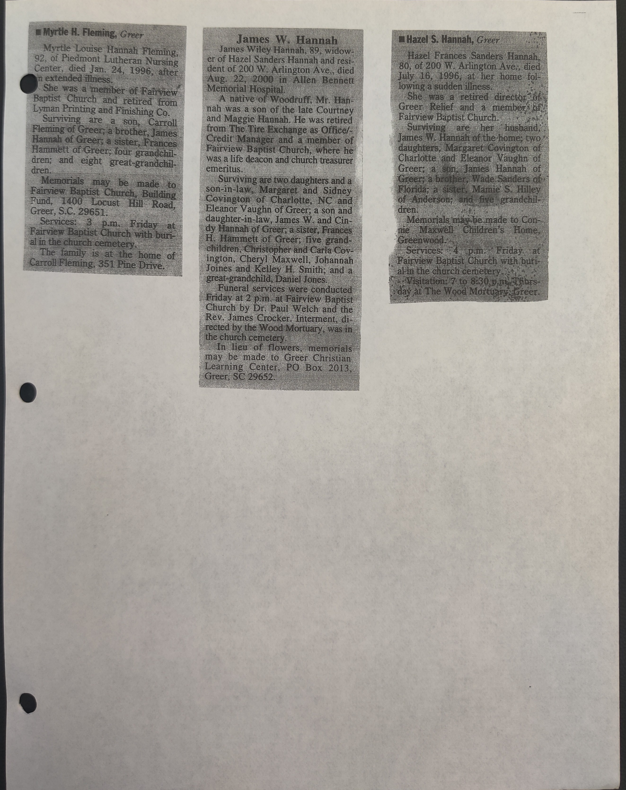 Photocopied obituaries -- Courtney (Cortney) W. Hannah, Myrtle Hannah Flemming, James W. Hannah and wife Hazel Sanders Hannah