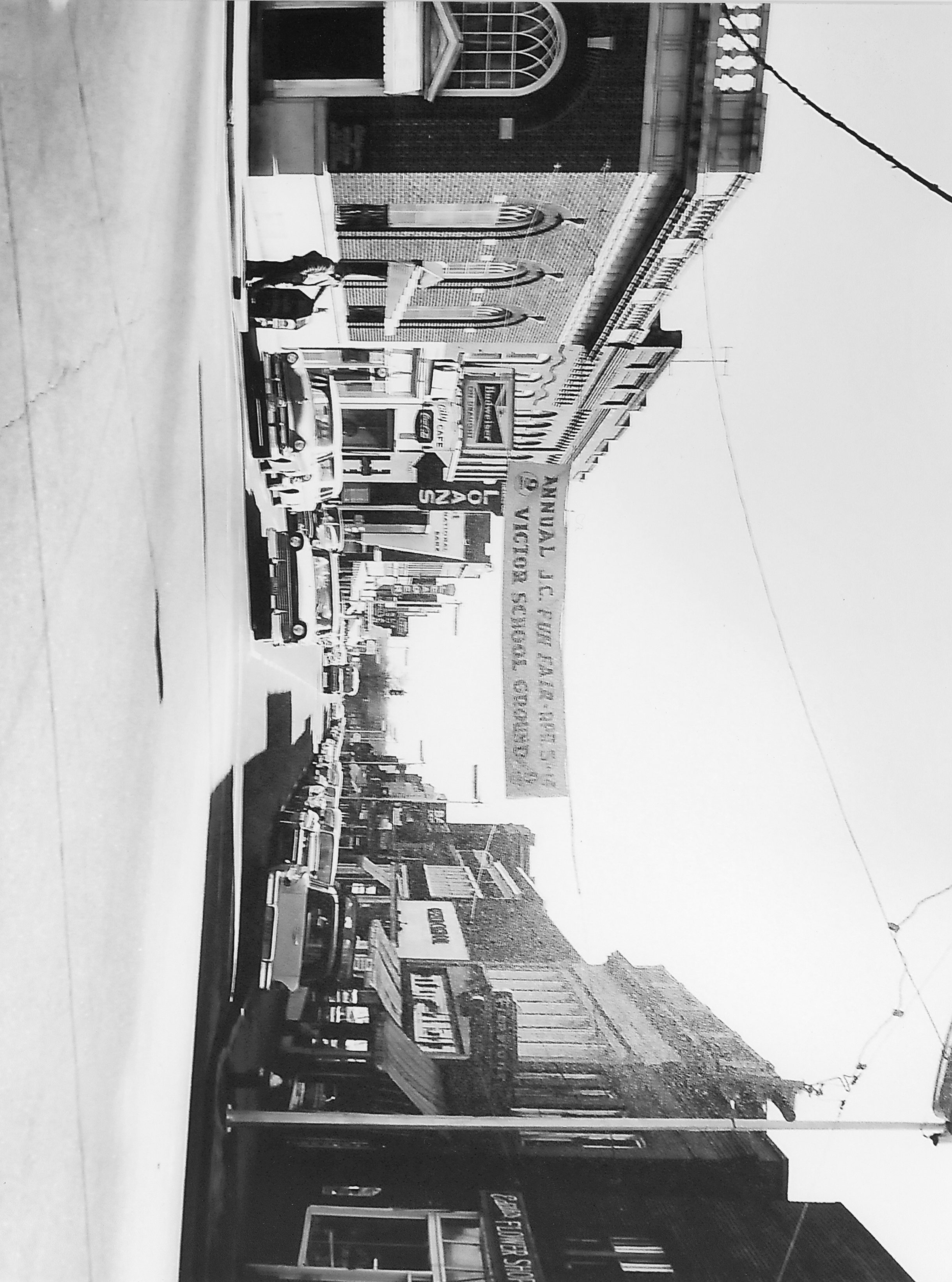 - Photograph of Trade Street featuring a banner saying, "Annual J. C. Fun Fair Apr. 5-14 Victor School Ground."