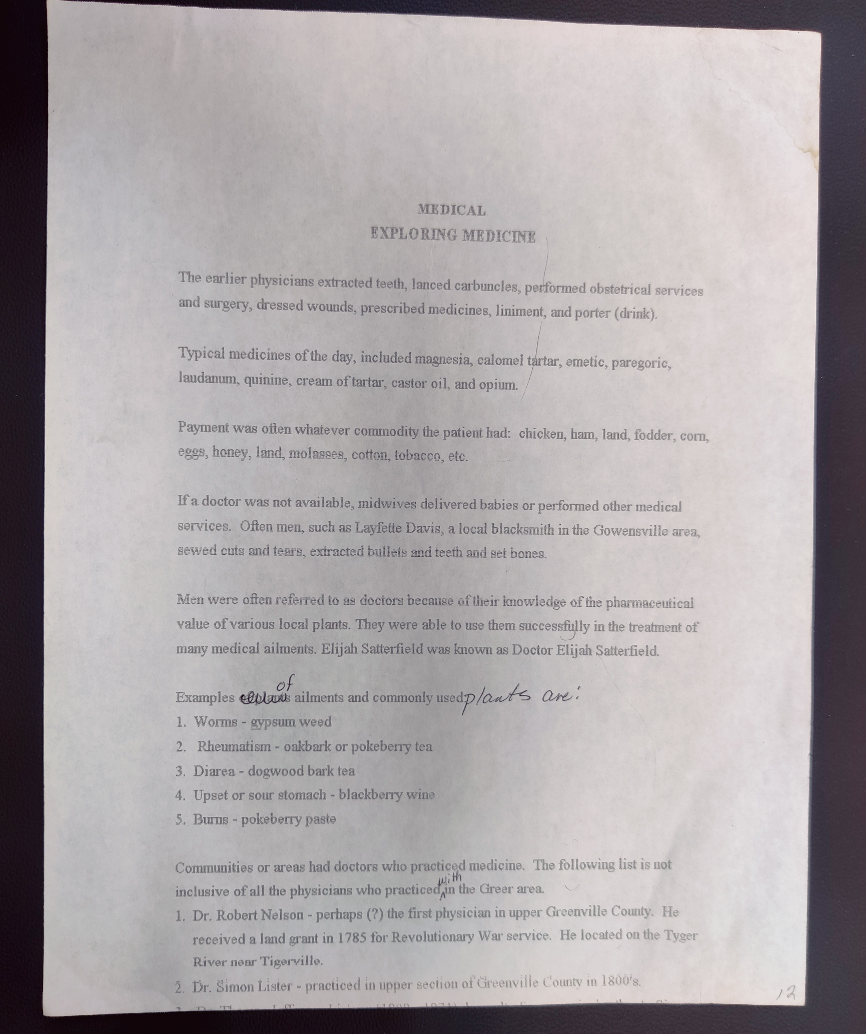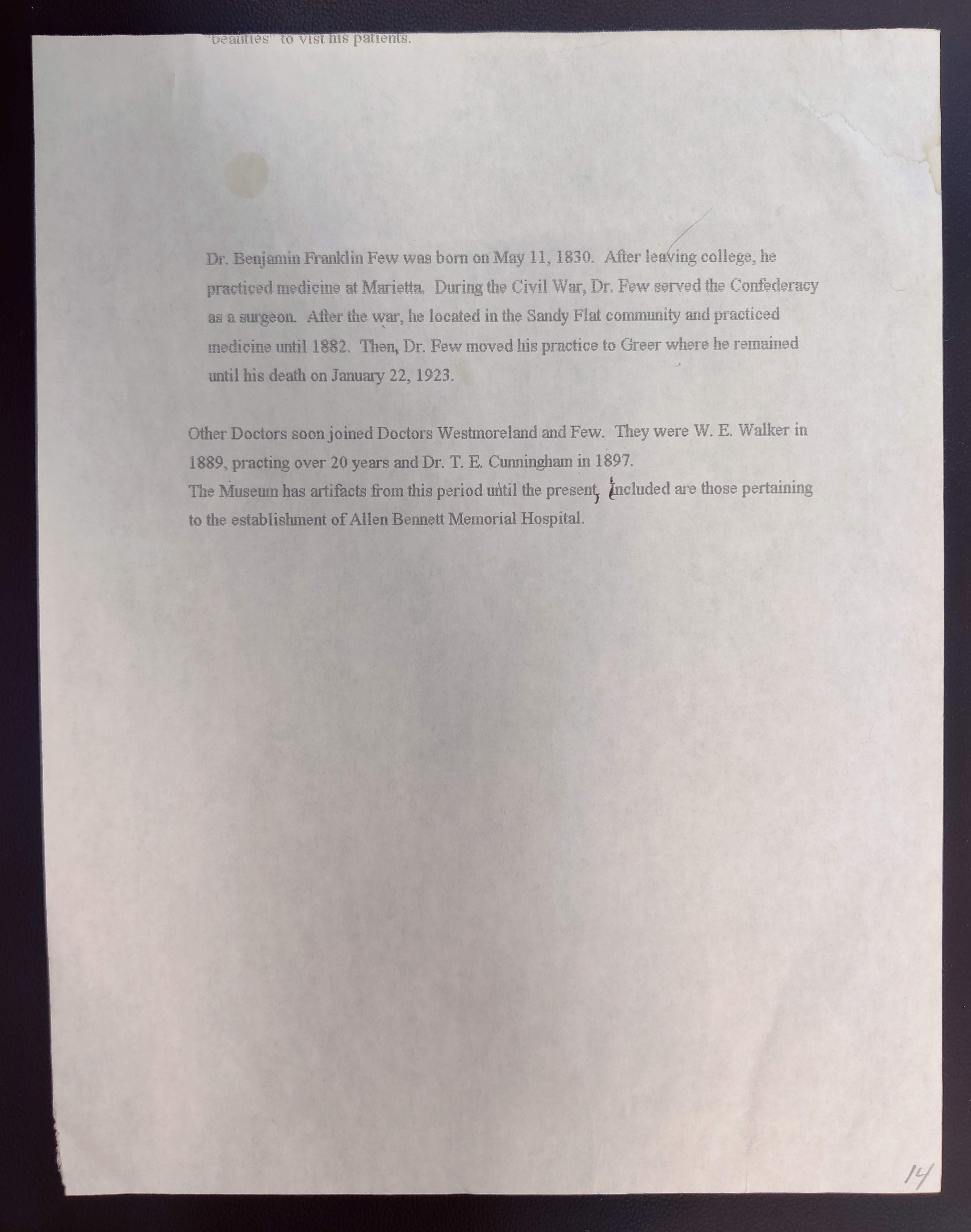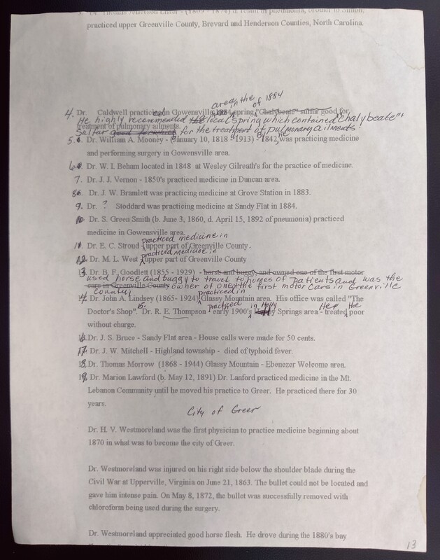 - An anonymously authored history of medical practitioners in the Greater Greenville area which was most likely written around the time of the construction of the Allen Bennett hospital. The accuracy of this document cannot be guaranteed.