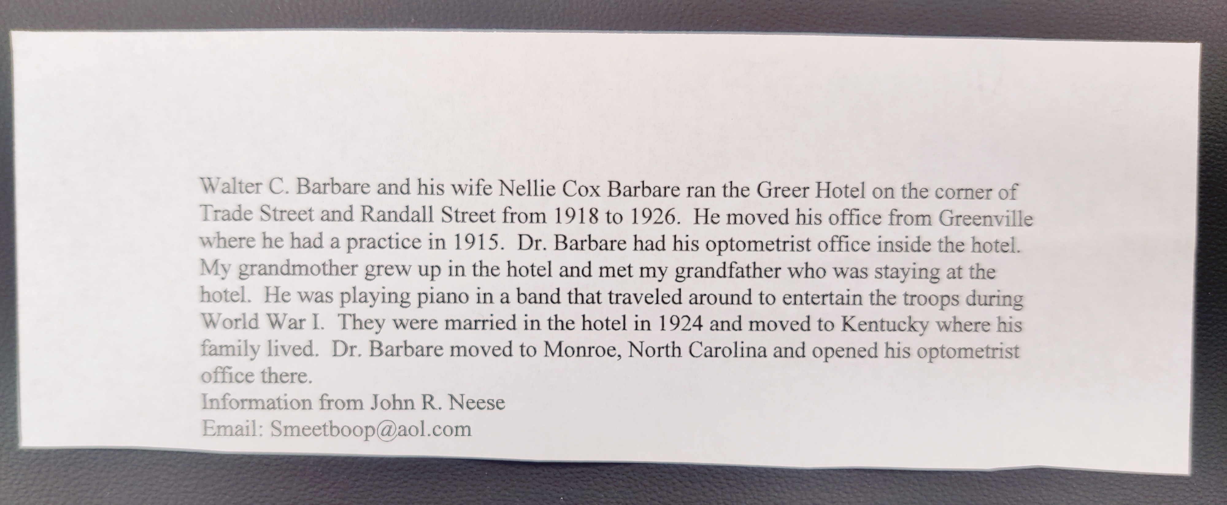 Walter C. Barbare and his wife Nellie Cox Barbare ran the Greer Hotel on the corner of Trade Street and Randall Street from 1918 to 1926. he moved his office form Greenville where he had a practice in 1915. Dr. Barebare had his optometrist office inside the hotel. My grandmother grew up in the hotel and met my grandfather who was staying at the hotel. He was playing piano in a band that traveled around to entertain the troops during World War I. They were married in the hotel in 1924 and moved to Kentucky where his family lived. Dr. Barbare moved to Monroe, North Carolina and opened his Optometrist office there.