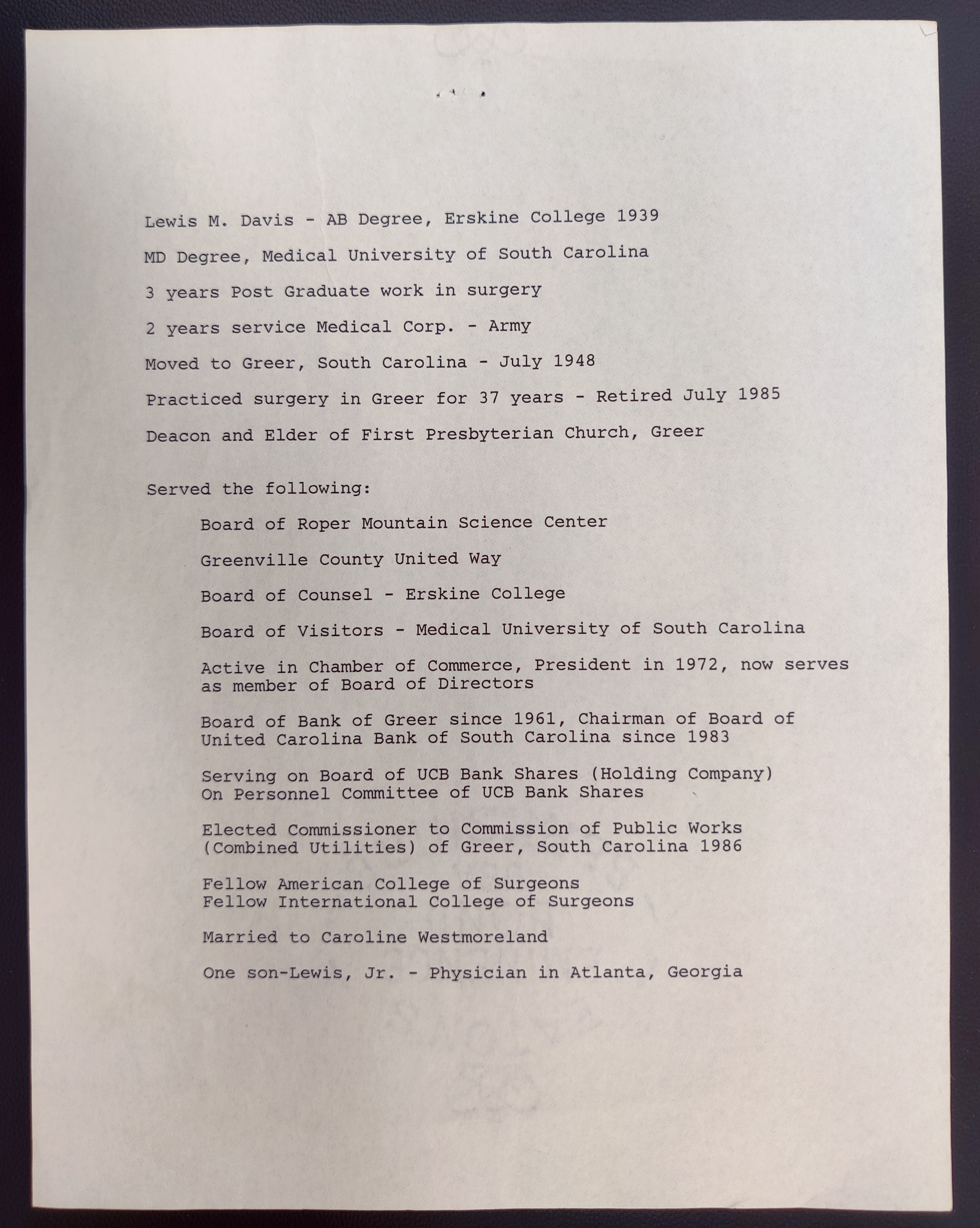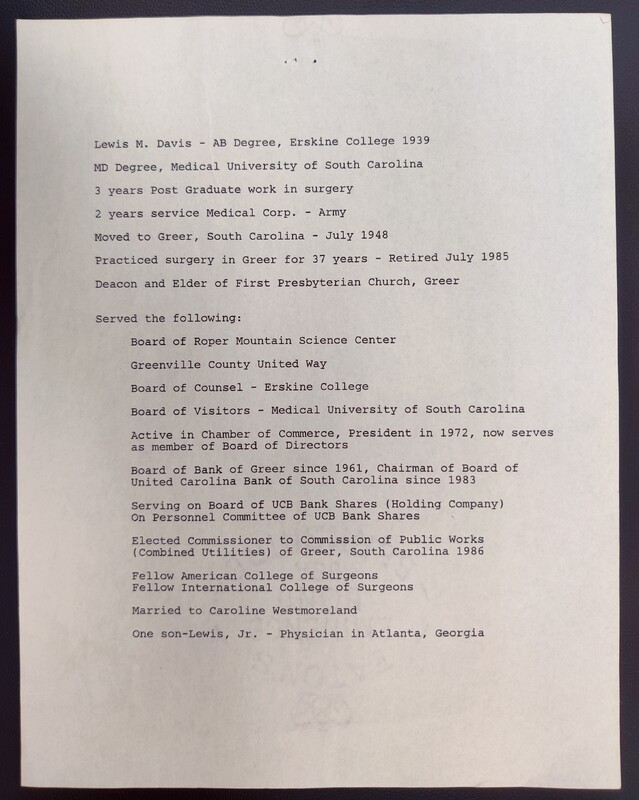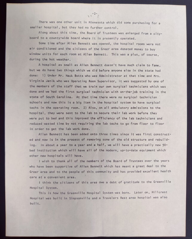 Explanation of history that led to the construction of a hospital in Greer. Authored by Dr. Lewis M. Davis. The accuracy of this document cannot be guaranteed.