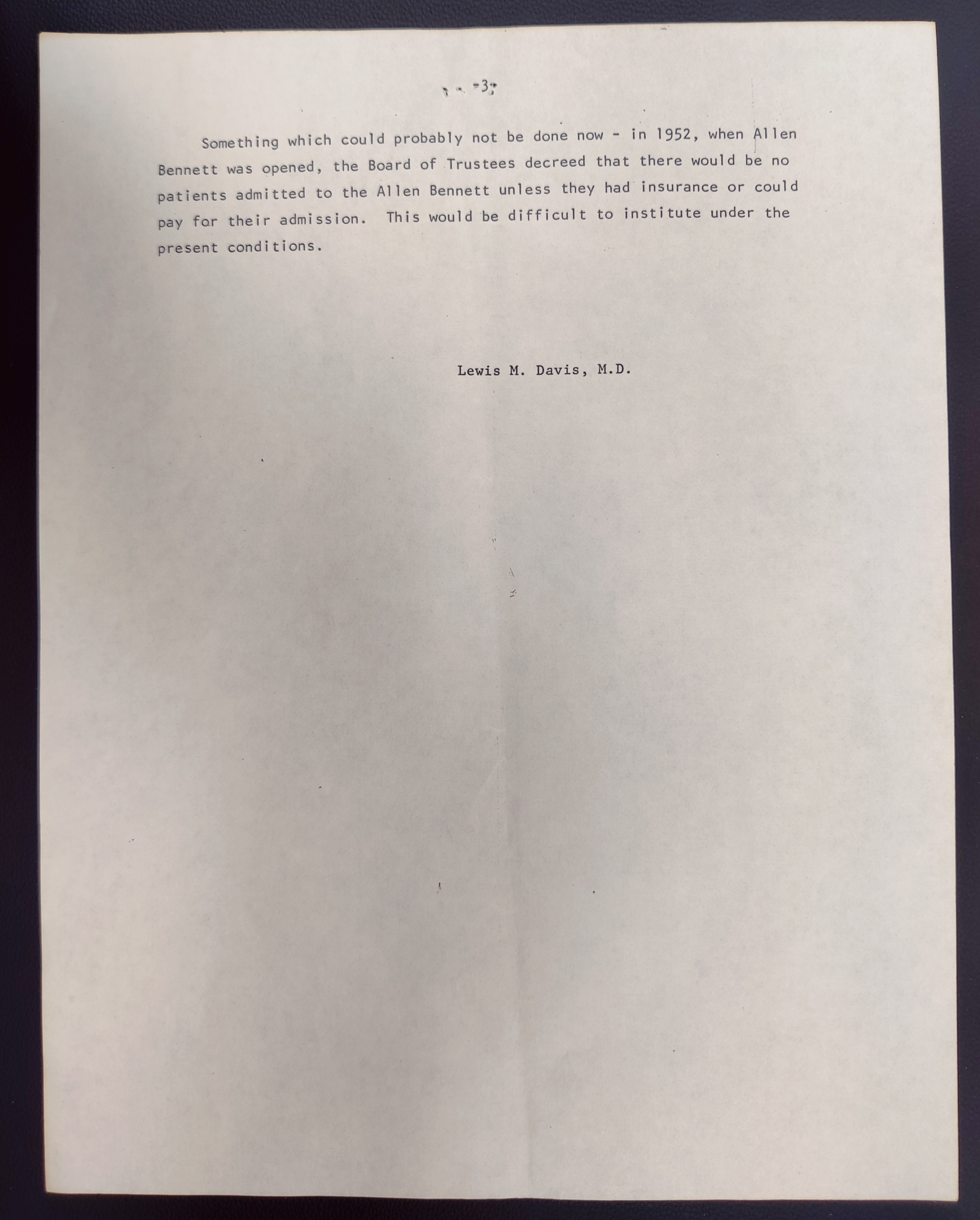 Something which could probably not be done now in 1952, when Allen Bennett was opened, the Board of Trustees decreed that there would be no patients admitted to the Allen Bennett unless they had insurance or could pay for their admission. This would be difficult to institute under the present conditions.