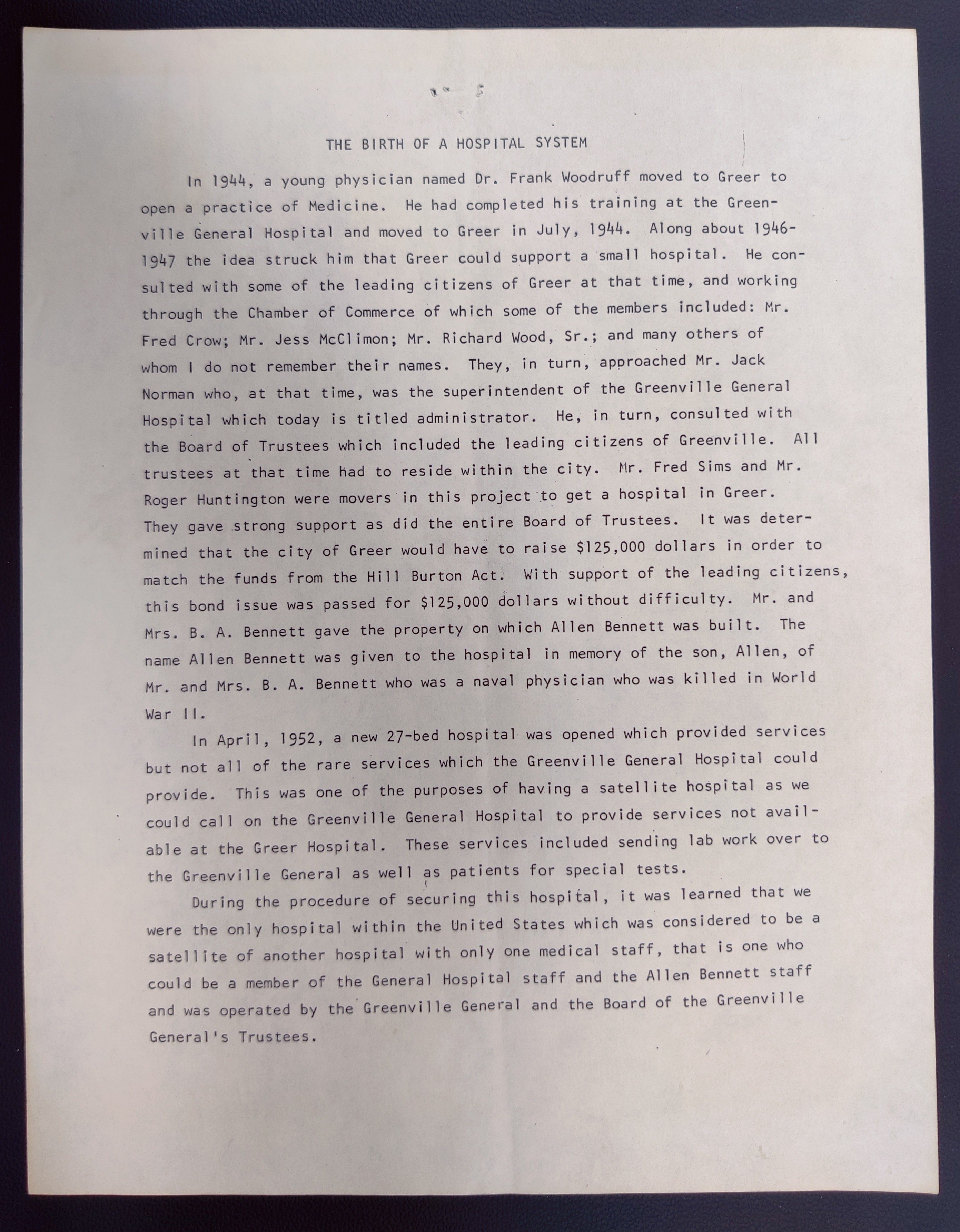 In 1944, a young physician named Dr. Frank Woodruff moved to Greer to open a practice of Medicine. He had completed his training at the Greenville General Hospital and moved to Greer in July, 1944. Along about 1946- 1947 the idea struck him that Greer could support a small hospital. He consulted with some of the leading citizens of Greer at that time, and working through the Chamber of Commerce of which some of the members included: Mr. Fred Crow; Mr. Jess McClimon; Mr. Richard Wood, Sr.; and many others of whom I do not remember their names. They, in turn, approached Mr. Jack Norman who, at that time, was the superintendent of the Greenville General Hospital which today is titled administrator. He, in turn, consulted with the Board of Trustees which included the leading citizens of Greenville. All trustees at that time had to reside within the city. Mr. Fred Sims and Mr. Roger Huntington were movers in this project to get a hospital in Greer. They gave strong support as did the entire Board of Trustees. It was determined that the city of Greer would have to raise $125,000 dollars in order to match the funds from the Hill Burton Act. With support of the leading citizens, this bond issue was passed for $125,000 dollars without difficulty. Mr. and Mrs. B. A. Bennett gave the property on which Allen Bennett was built. The name Allen Bennett was given to the hospital in memory of the son, Allen, of Mr. and Mrs. B. A. Bennett who was a naval physician who was killed in World War II.