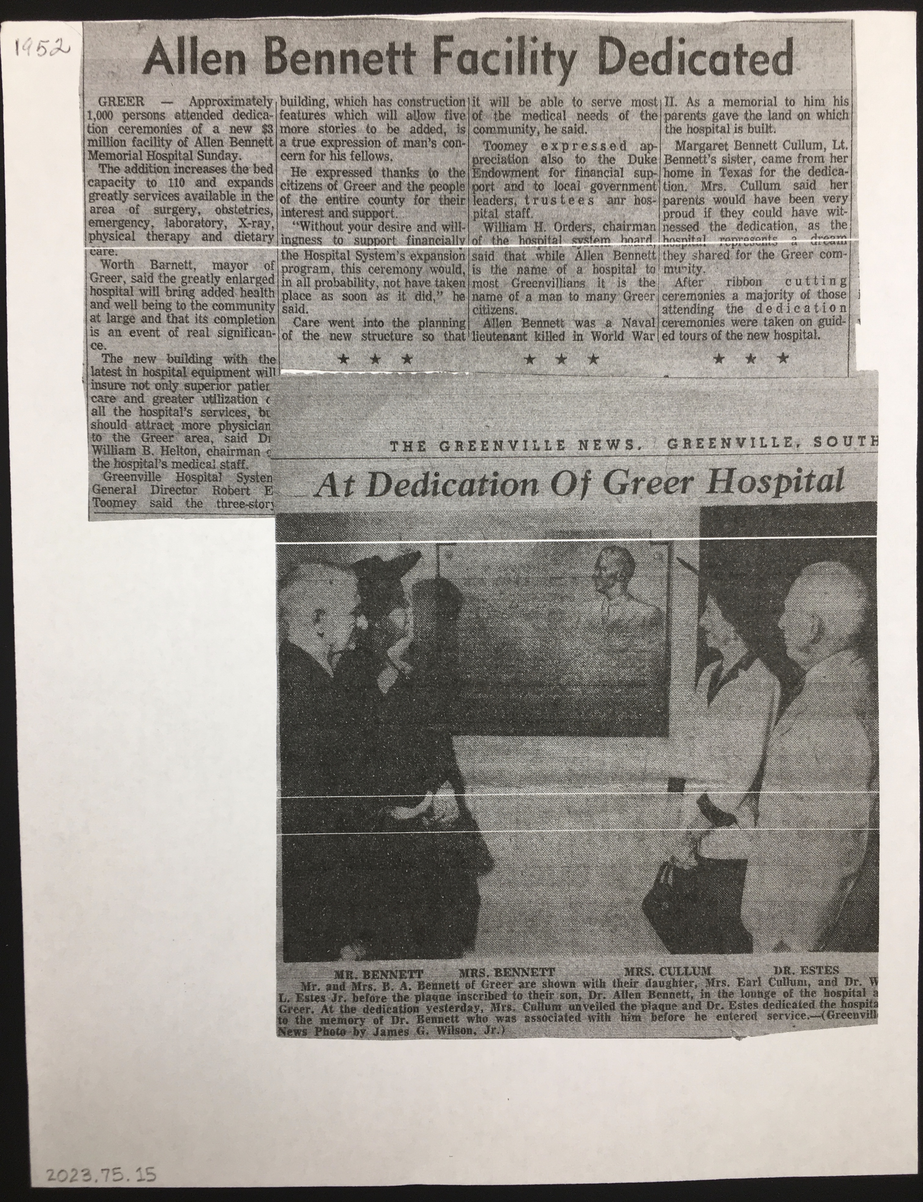 - Photocopy of newspaper clippings from the Allen Bennett Memorial Hospital's original dedication in 1952 and expansion in 1973. Material includes a 1952 photograph of Mr. and Mrs. Belton A. Bennett and information on the 1973 facilities.