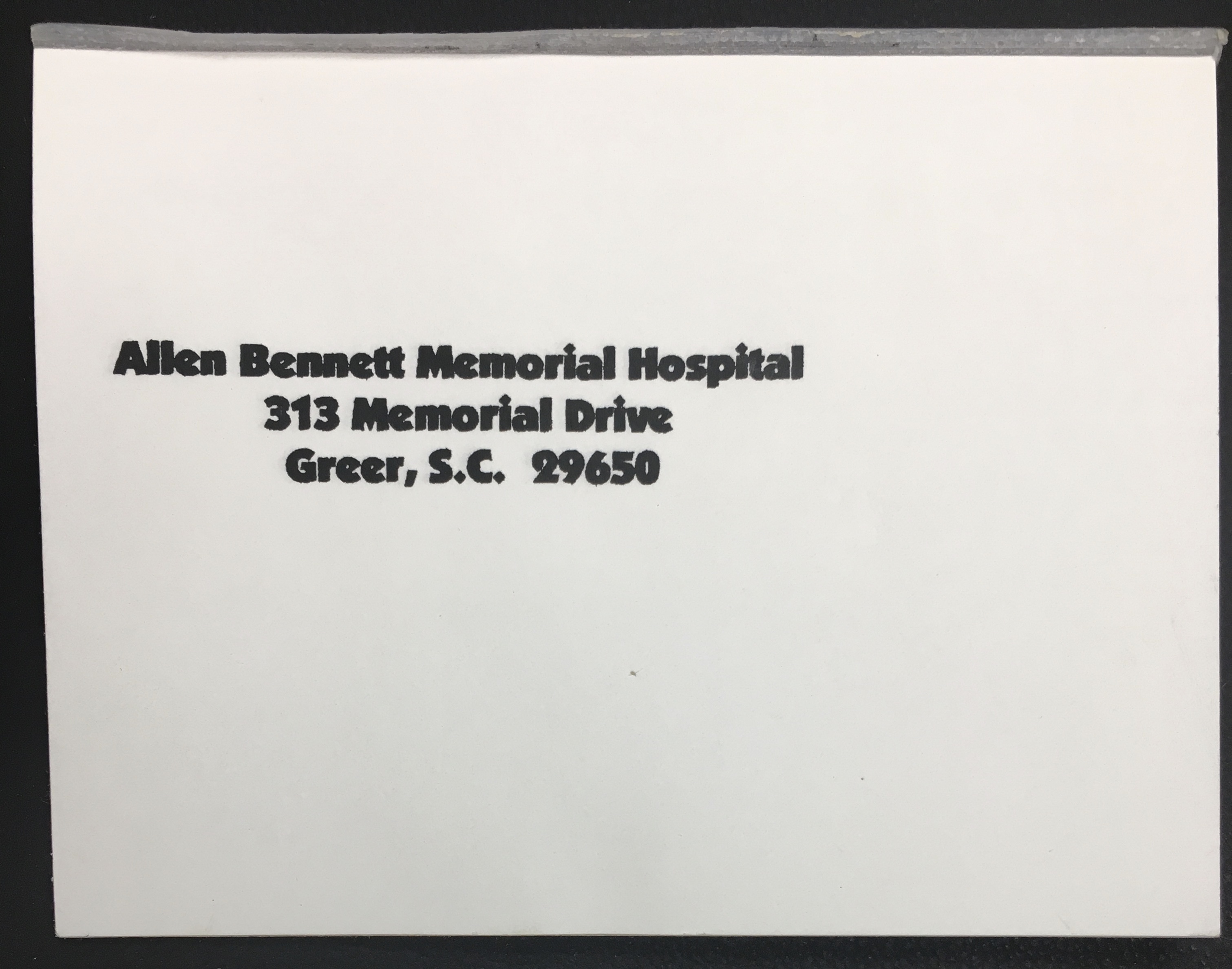 - Notepad with address for Allen Bennett Memorial Hospital on each sheet.