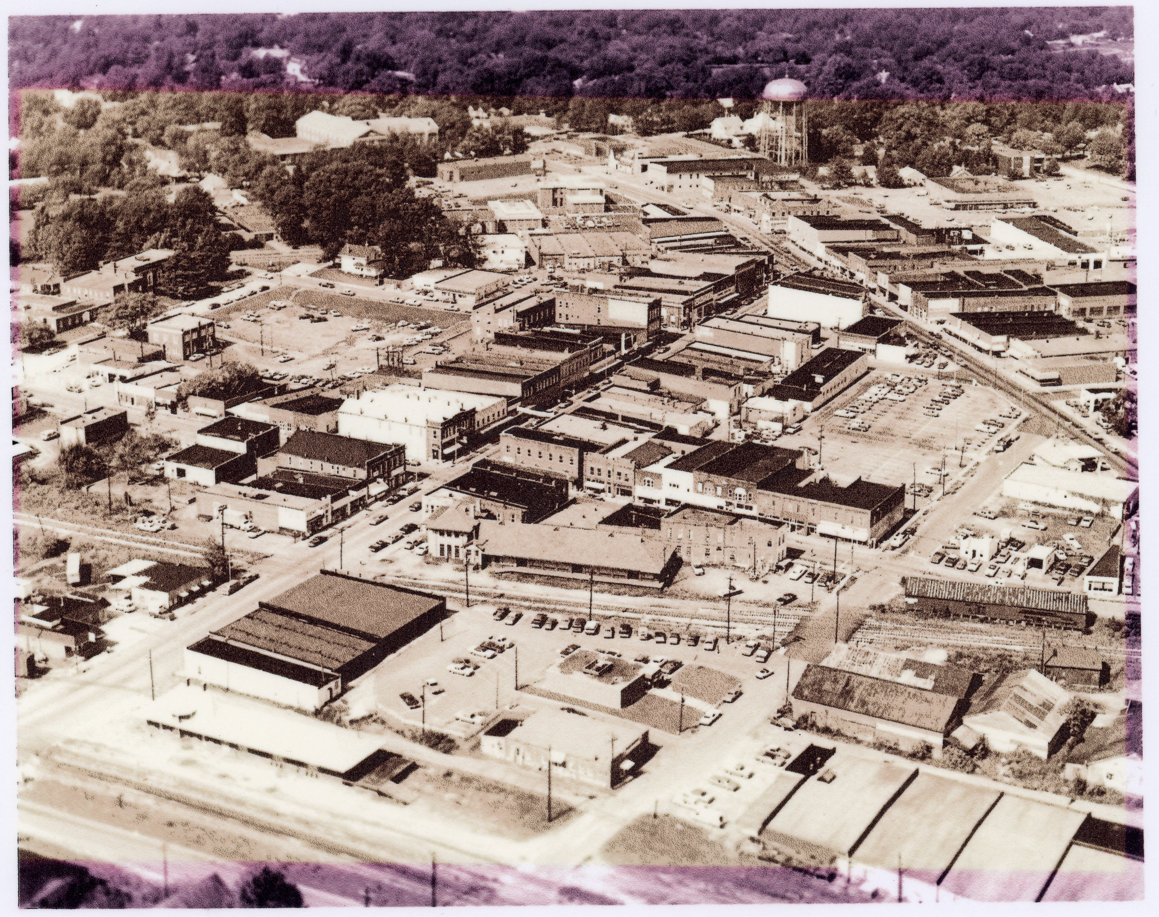 - Aerial photograph of downtown Greer showing Trade Street, the train stations, Depot Street, and Poinsett Street.