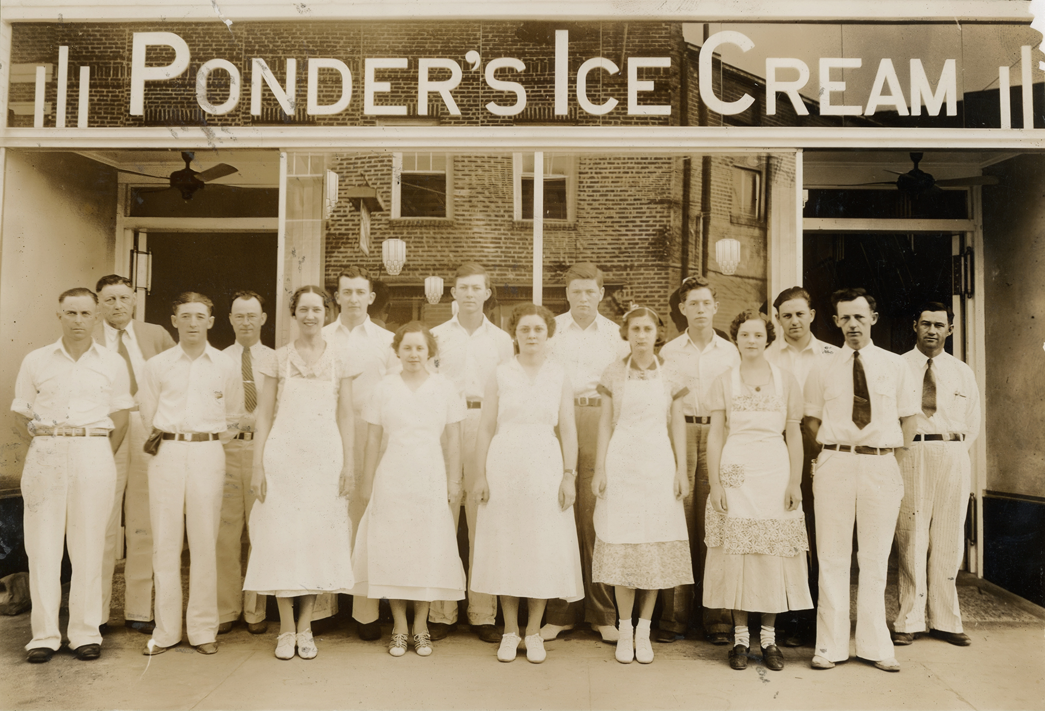 Paper photograph of Ponder's Ice Cream store at 127 E. Poinsett Street, with the staff standing in front. The photo had a modern paper attached which read: