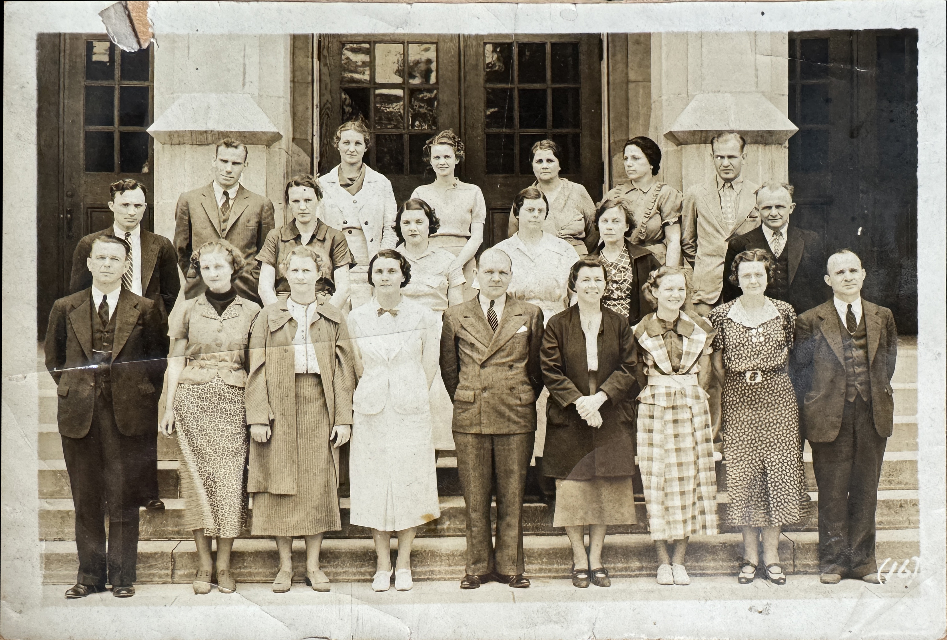 - Original photograph of the Greer High School faculty for 1933-34, showing 21 men and women standing on the front steps of the Davenport High School building. The photo is glued to a sheet of heavy paper, which appears to have originally been in a memory album. A handwritten inscription on the paper under the photo reads "Greer High Faculty — Davenport Hi — 1933-34.