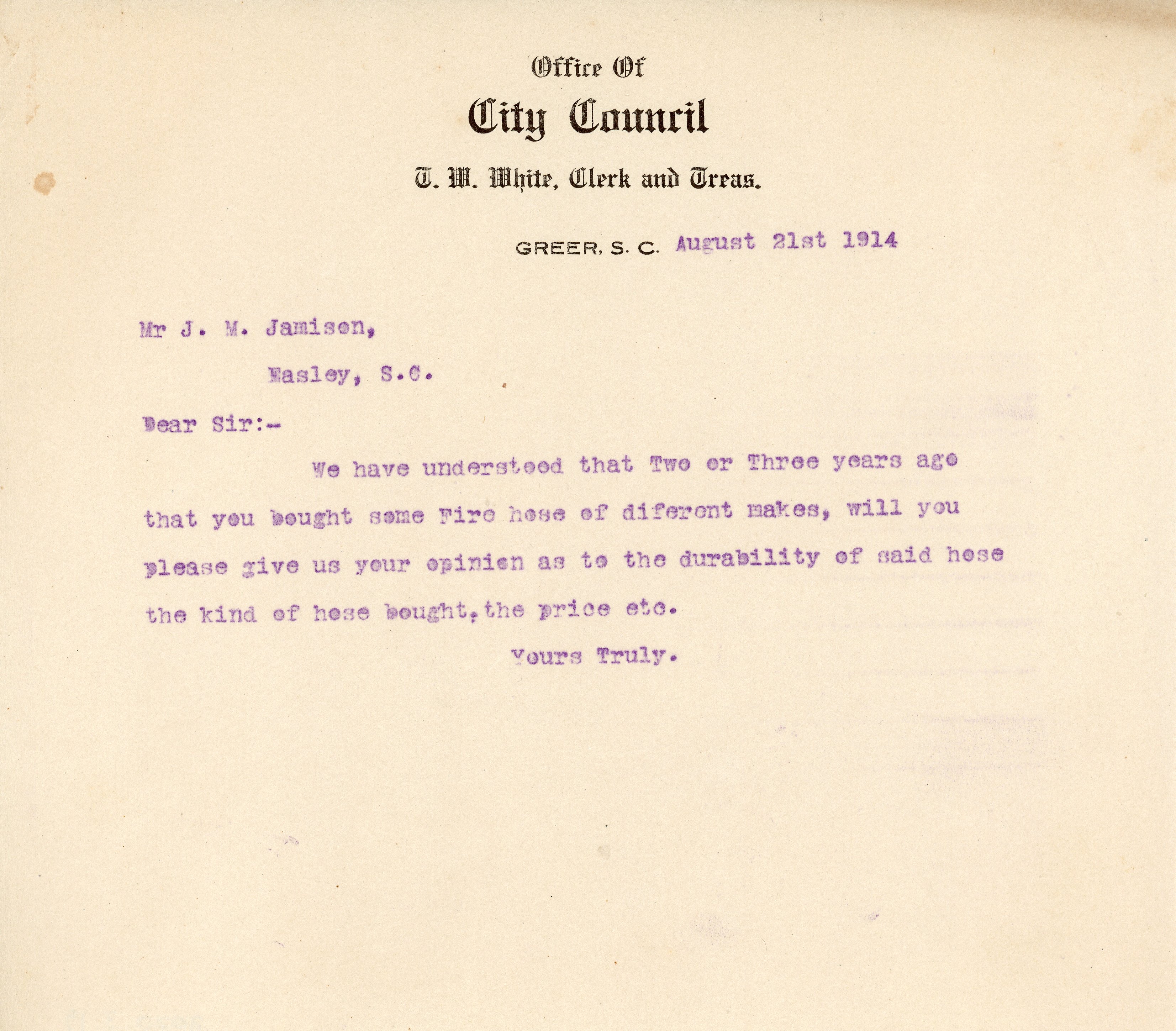Letter 21 August 1914 T. W. White to J. W. Jamison