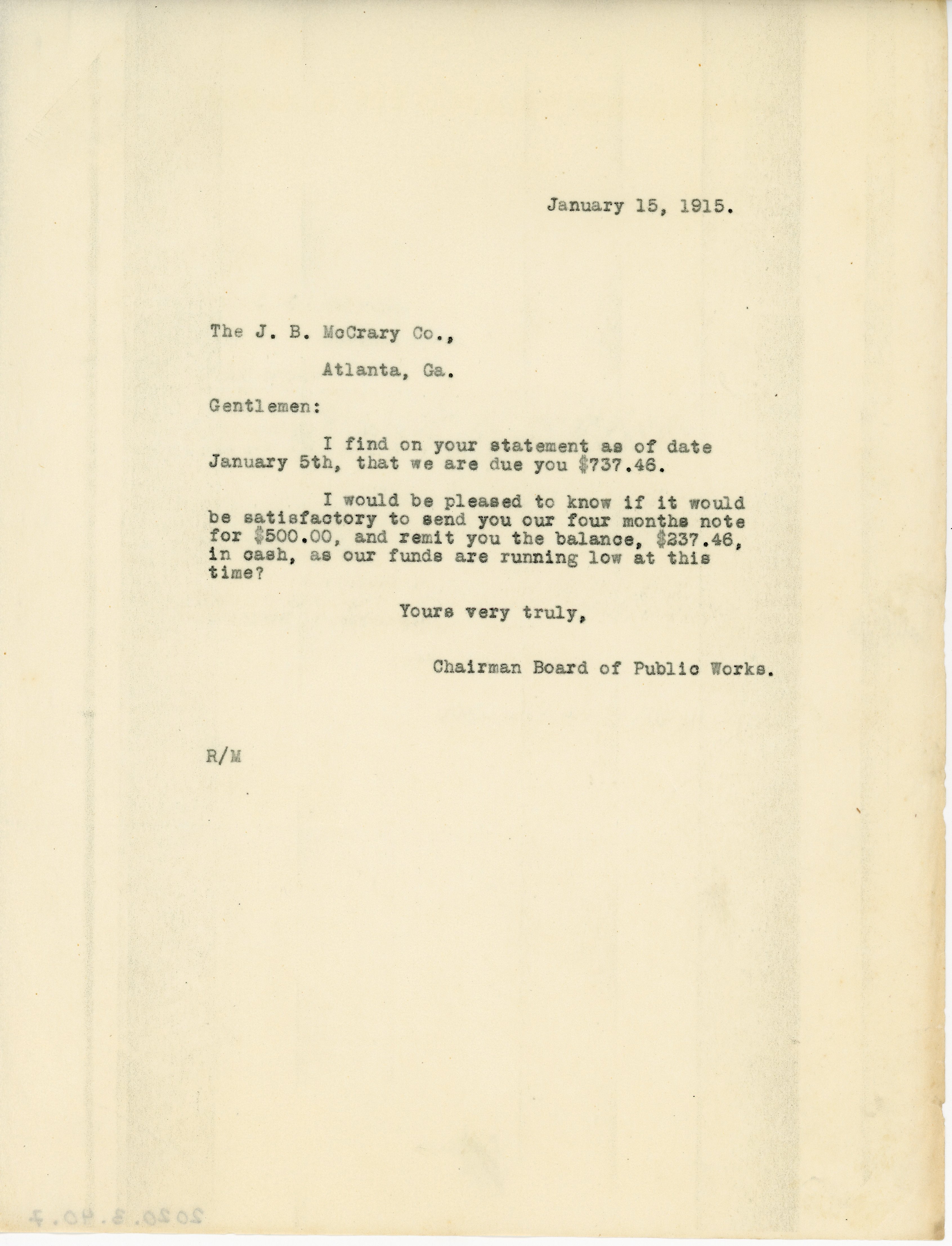 Letter 15 January 1915 J. A. Robinson to The J. B. McCrary Co.