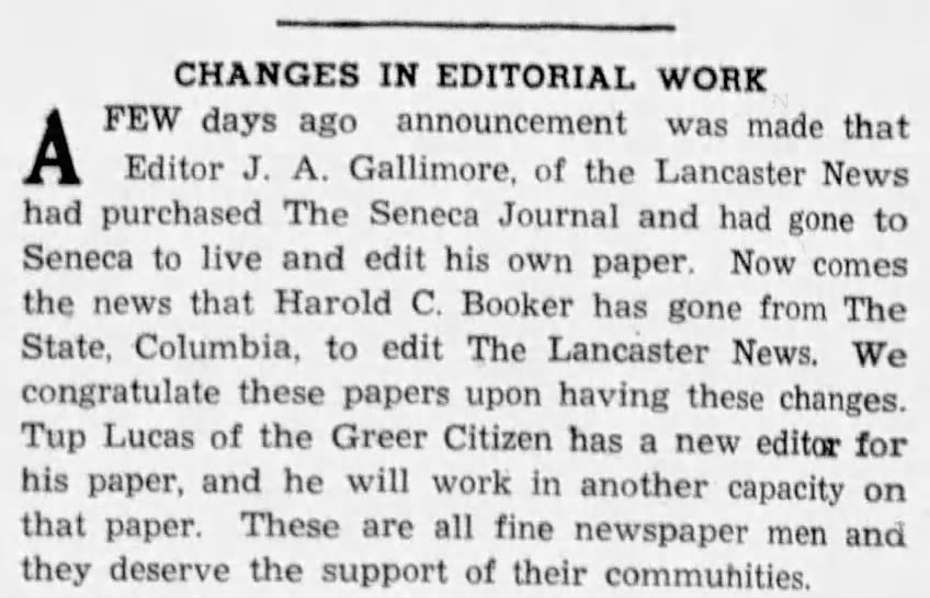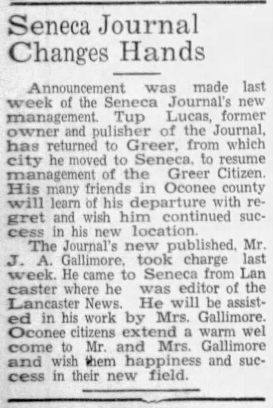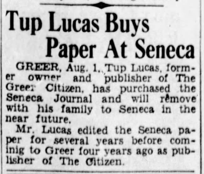 On August 2, 1941, a Greenville News article reported that Lucas, the former owner of the Citizen, had purchased the Seneca Journal and was moving to Seneca.