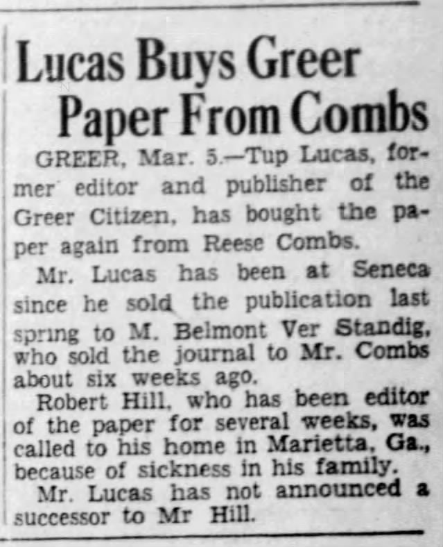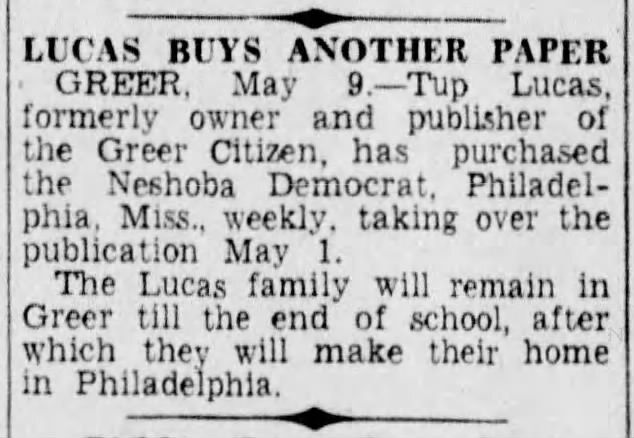 In March 1942, Lucas purchased the Greer Citizen for a second time from Reese Combs. He sold the Seneca Journal and moved to Greer. On June 1, 1942 he brought in Edd Burch as publisher and editor; the Greenville News reported that Lucas would "remain connected with the weekly in another capacity." On June 11 the Walterborough, S. C. Press and Standard reported that Lucas had sold the Seneca Journal and moved back to Greer to "resume management of the Greer Citizen" and that he had "found a new editor" for the paper — referencing Burch. In May, 1943, a Greenville News article called Lucas the former owner of the Greer Citizen and reported that he had purchased the Philadelphia, Mississippi Neshoba Democrat, taking over on May 1. The family moved to Mississippi later that year. - Relation