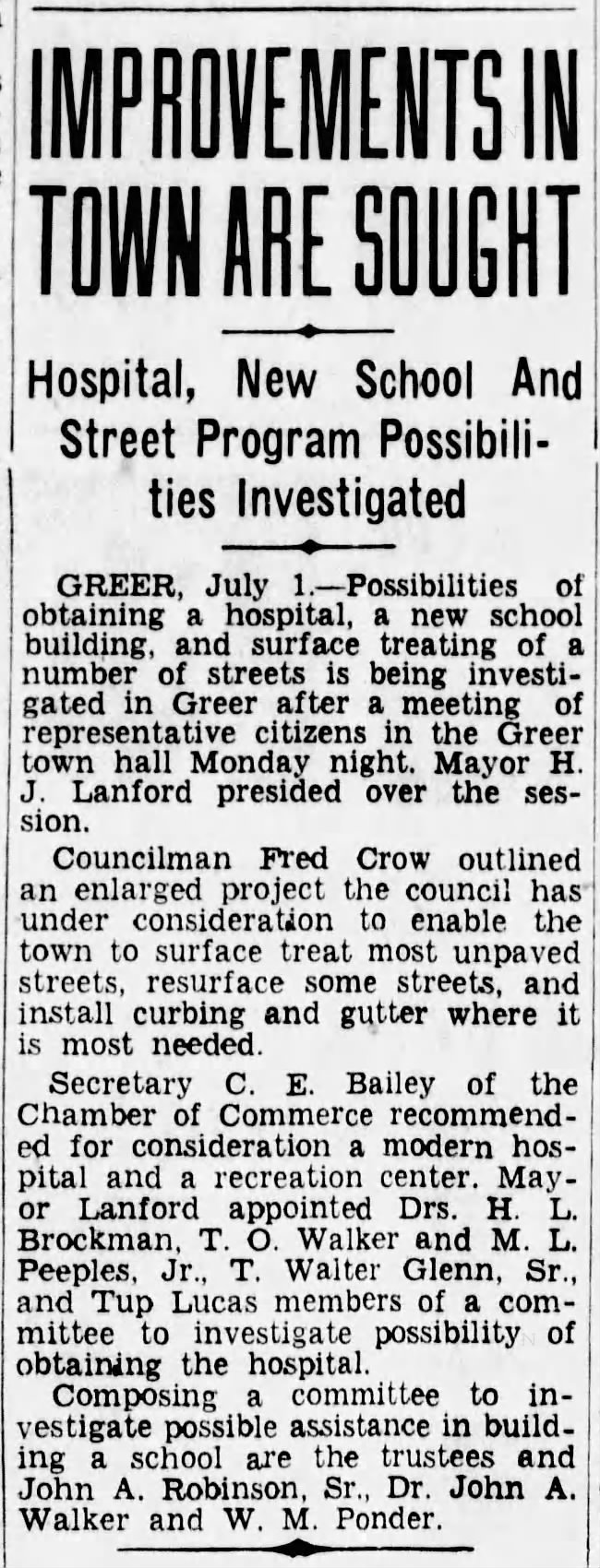 The Greer Community Council was formed in April 1938, and Tup Lucas was named President. In July of that year Mayor H. J. Lanford appointed Lucas to a committee to study the possibility of bringing a modern hospital to Greer.