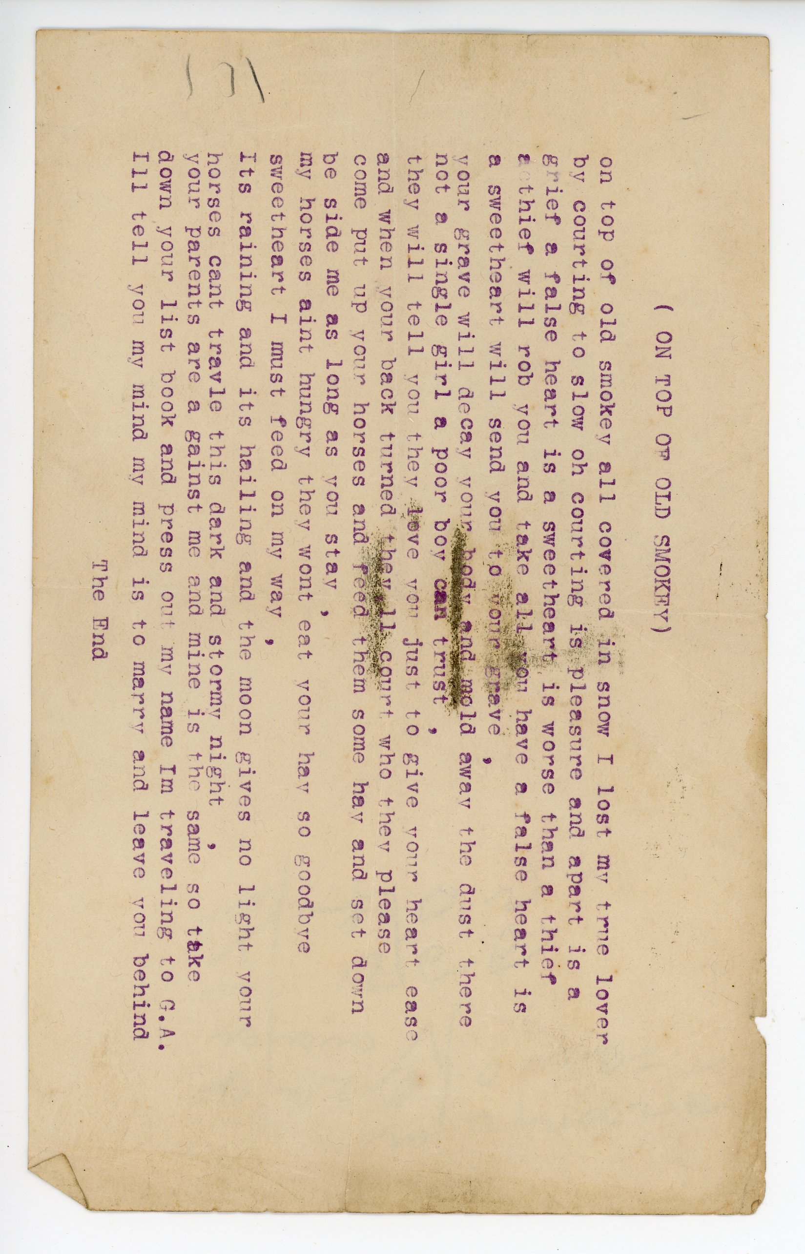 - On Top Of Old Smokey Song Undated and Unsigned