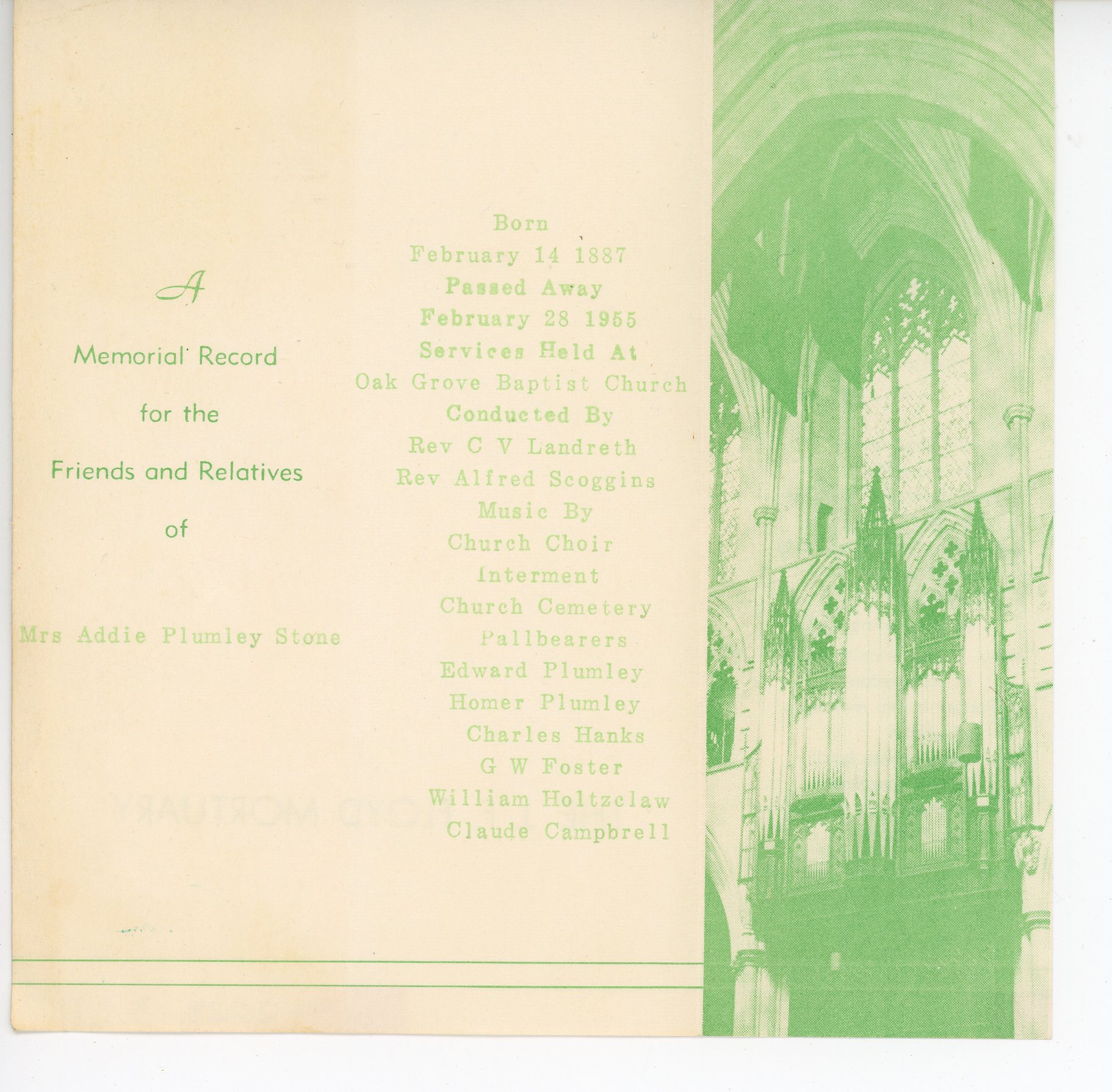 - Funeral Bulletin for the funeral of Mrs. Addie Plumley Stone born February 14, 1887, died February 28, 1955