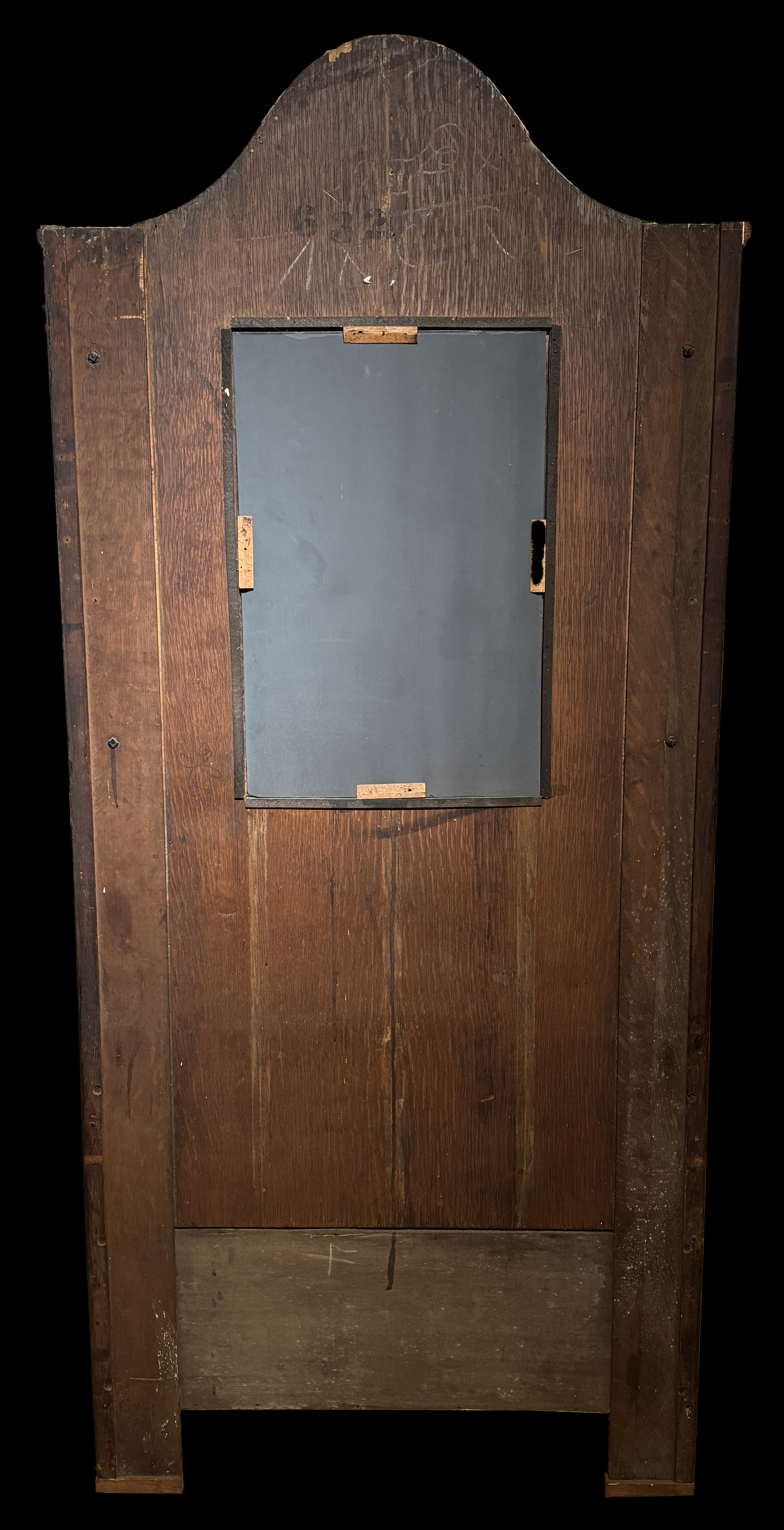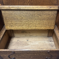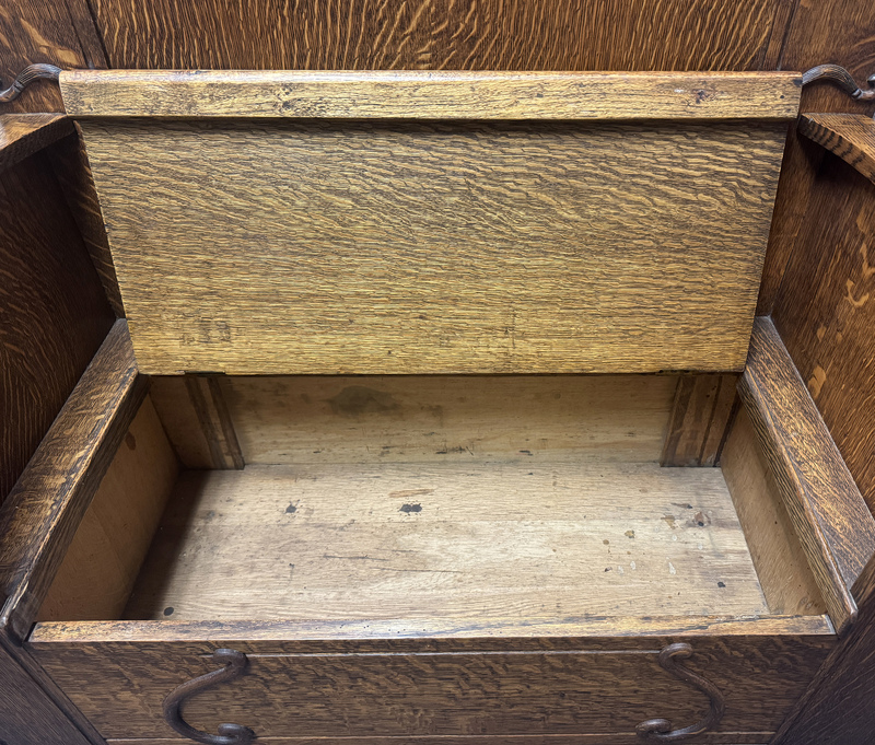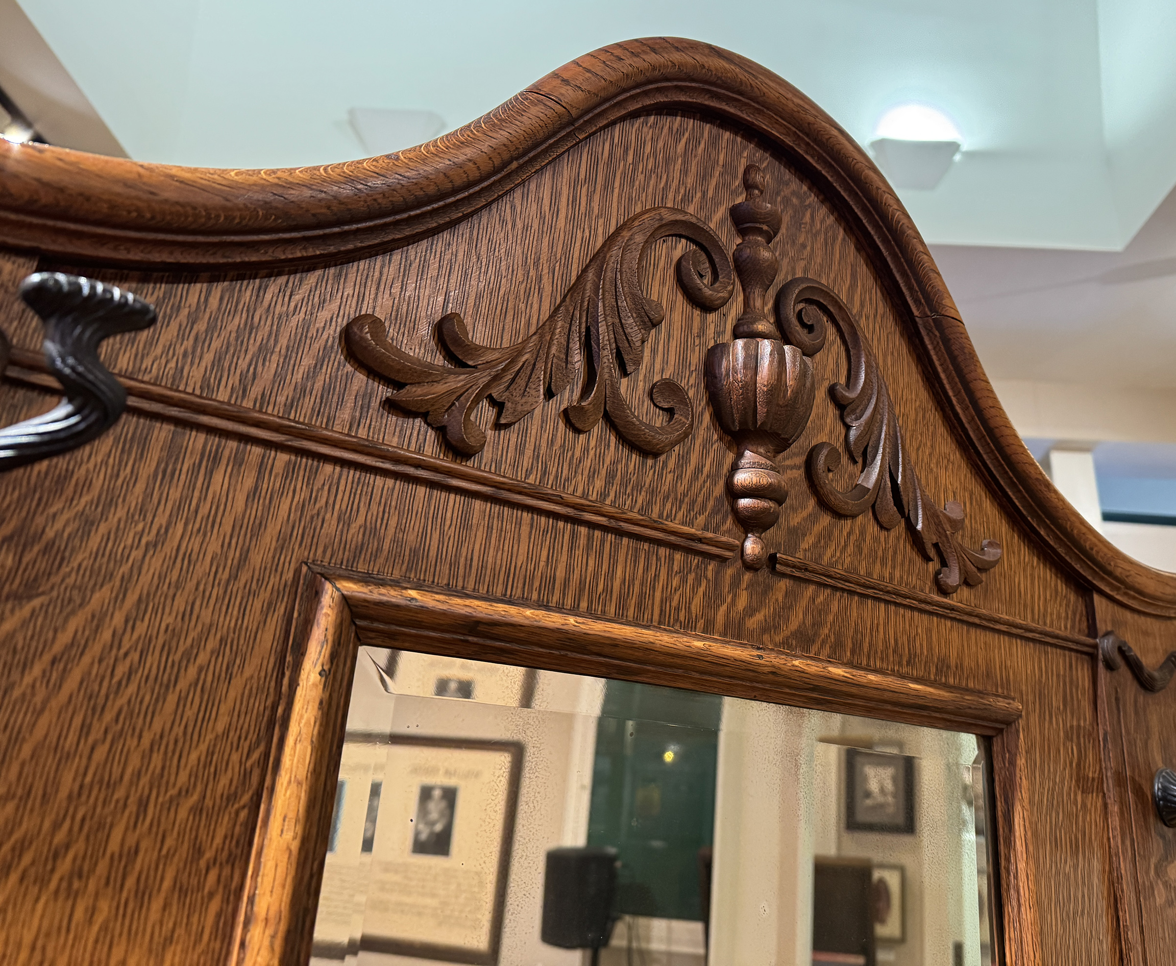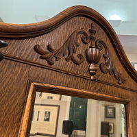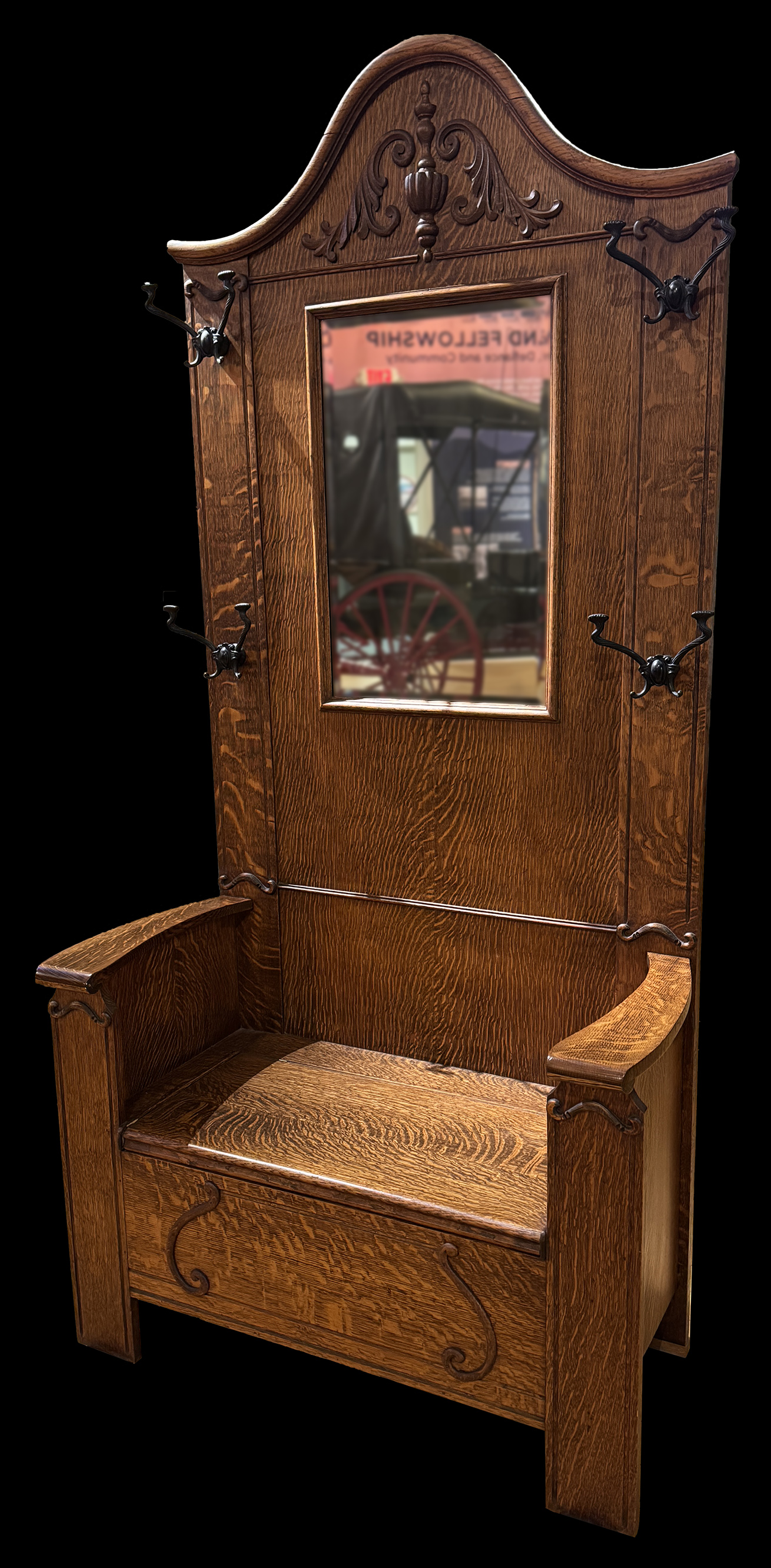 - Hall tree made of curly oak. Chest bench with arms; tall mirrored back. 38.5" wide, 79.25" tall, 18.5" deep.