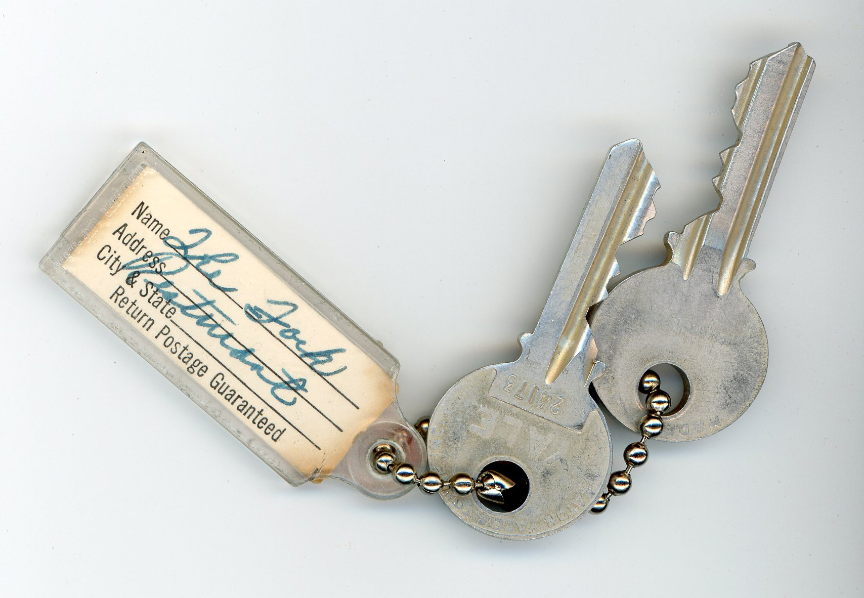 - Small keyring with two matching aluminum Yale keys. Labeled "The Fork Restaurant" with fountain pen on one side; preprinted "Greer Remodeling Co., 404 Trade Street, Greer, SC Phone 877-4503" on the back.