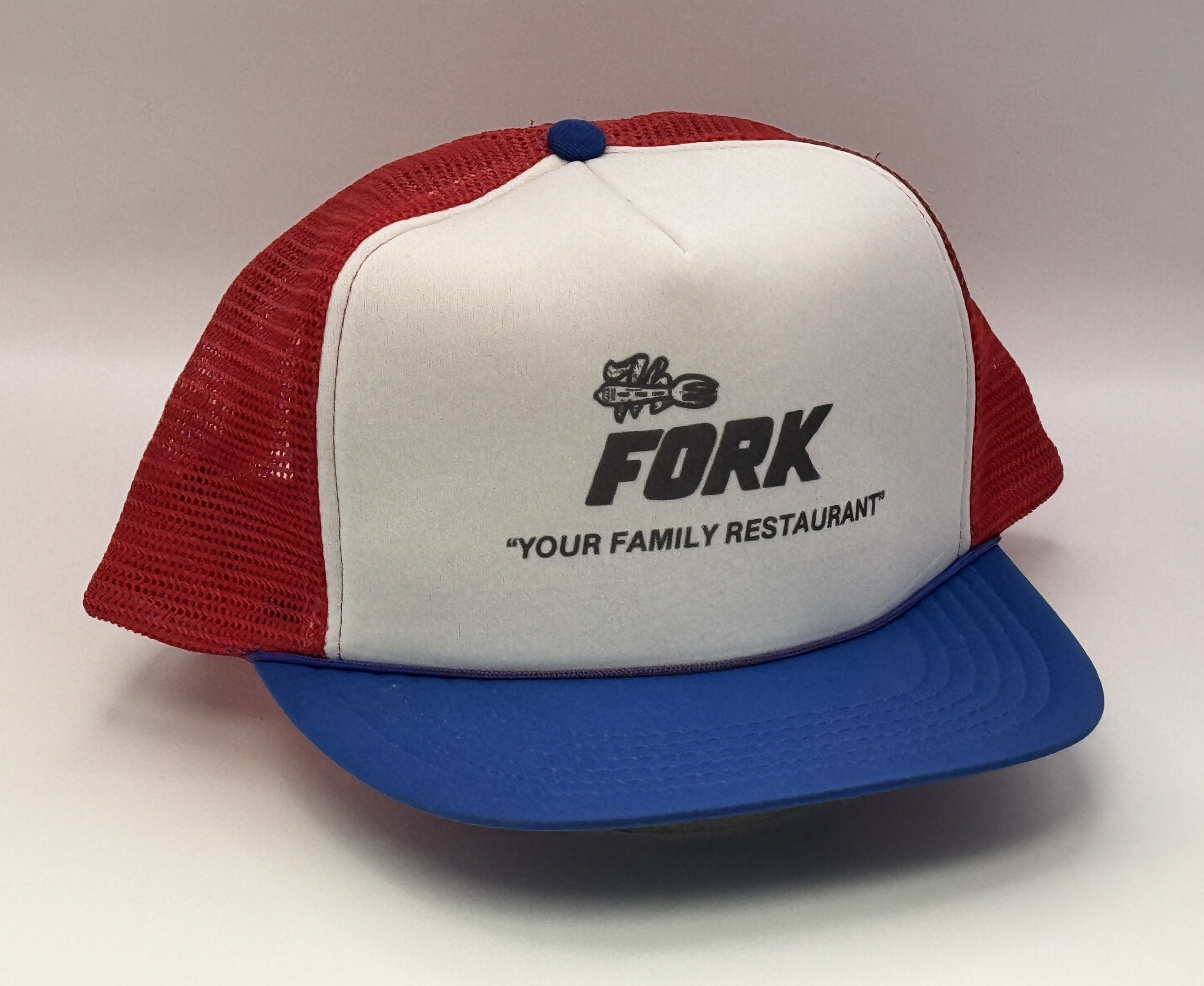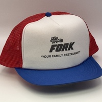 - Baseball cap of white padded polyester, blue bill, and red mesh back. Fork Restaurant logo on front.