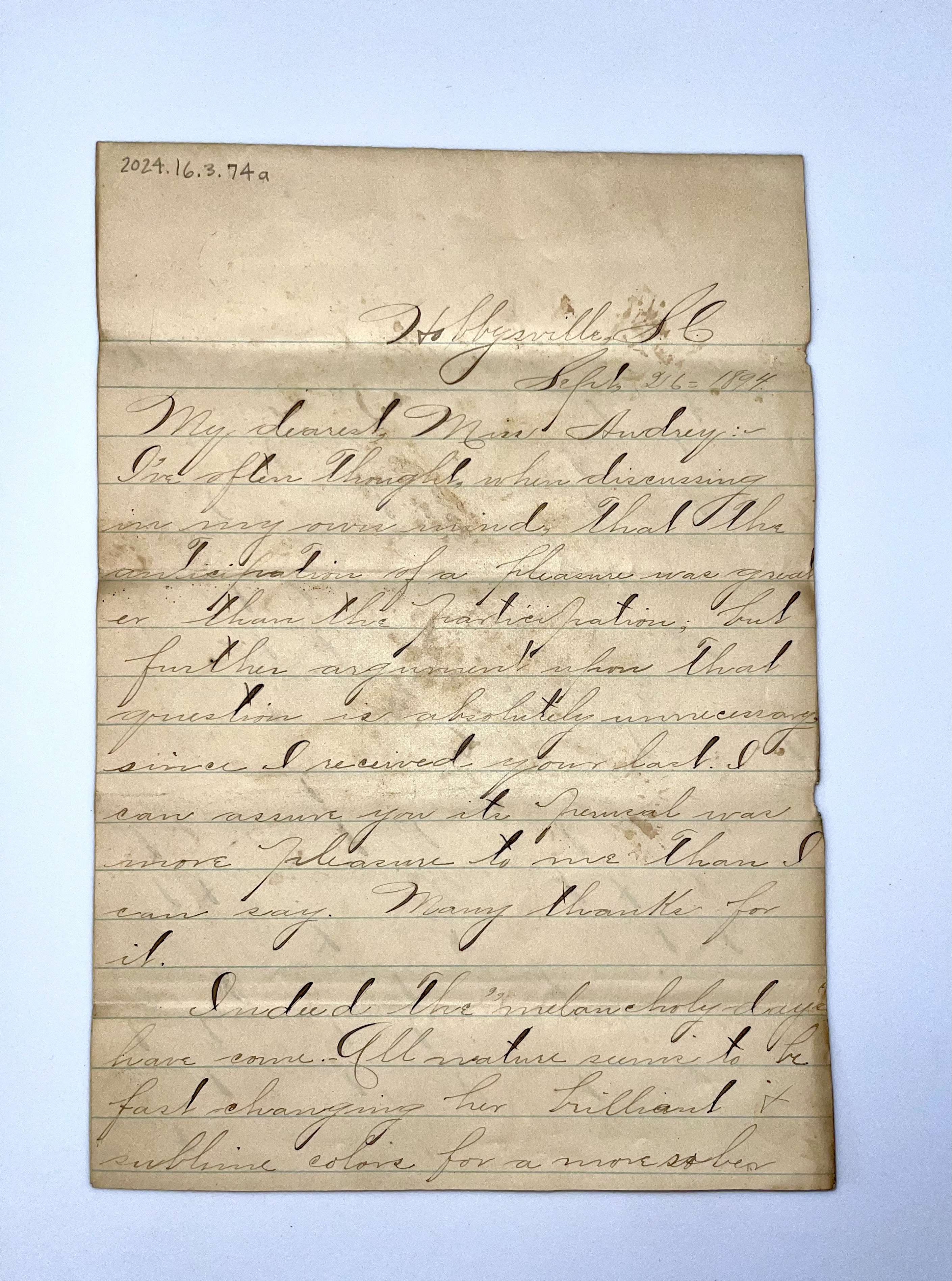 - Letter: Sept. 26, 1894. J. Earle A. to Audrey Davis