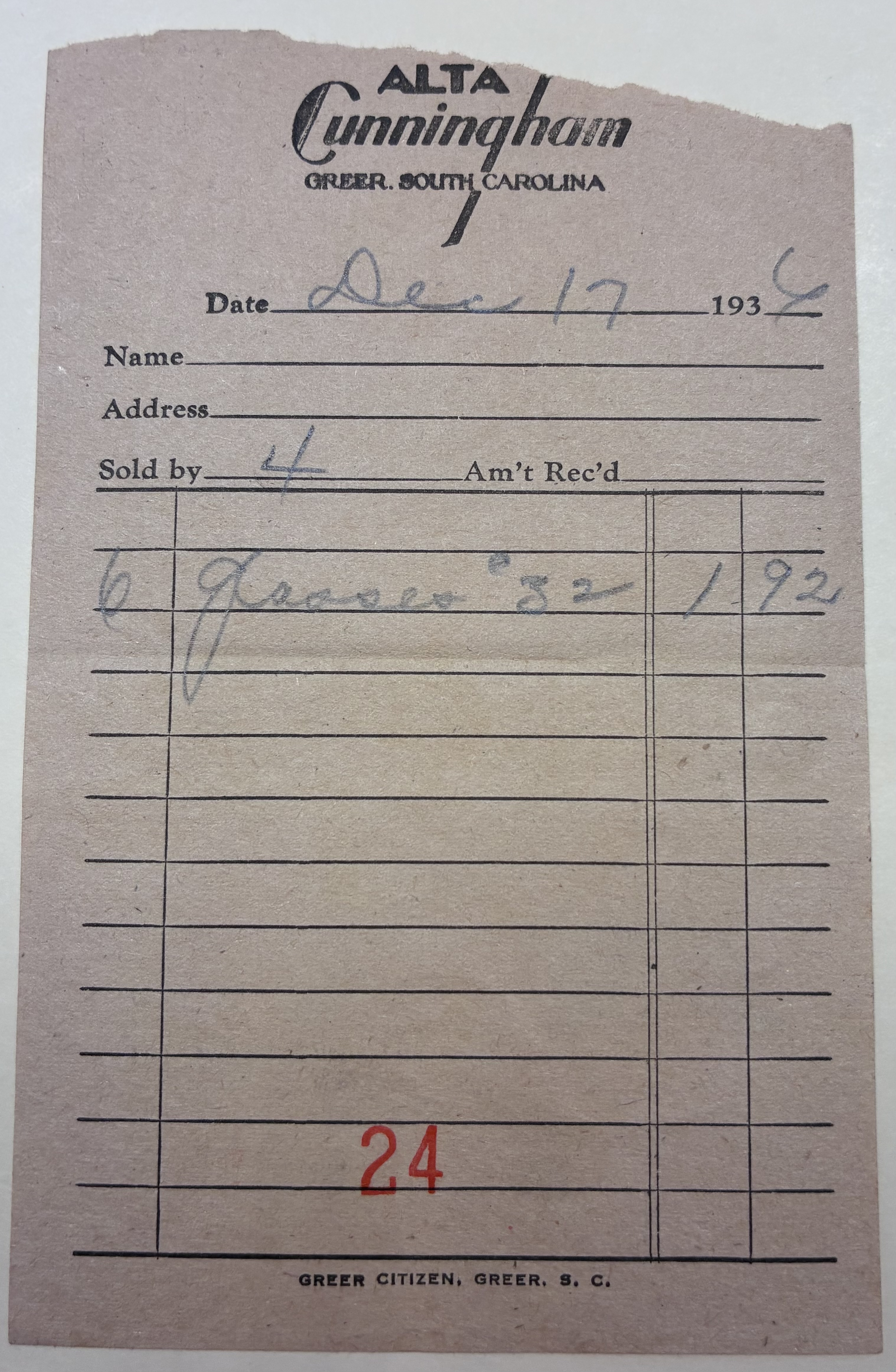 Part of ALTA Cunningham Greer, SC Receipt, December 17, 1936