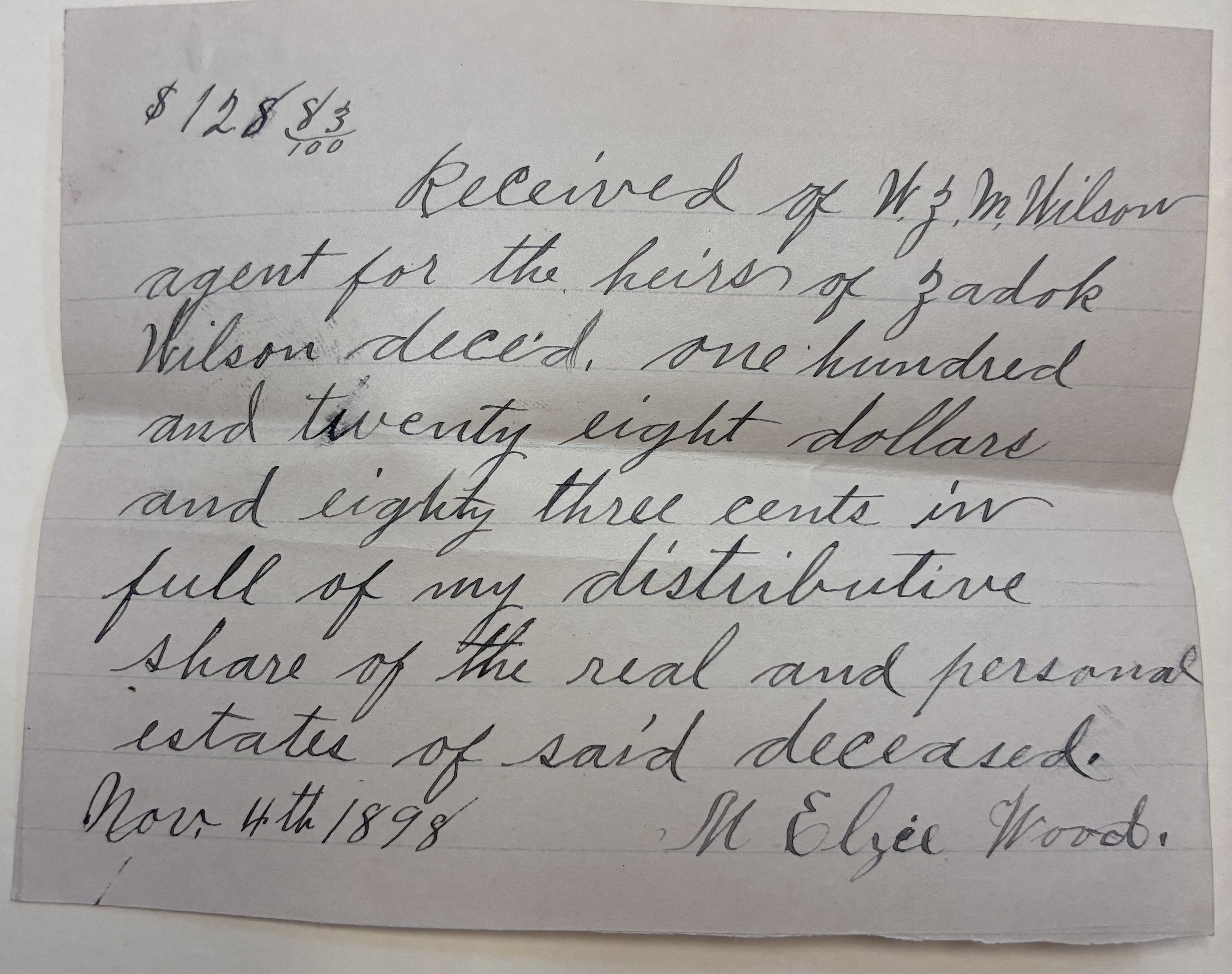 - Received of W.Z.M Wilson agent for the heirs of Zadok Wilson dece'd one hundred and twenty eight dollars and eighty three cents... Nov. 4th 1898 M.Elyie Wood