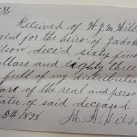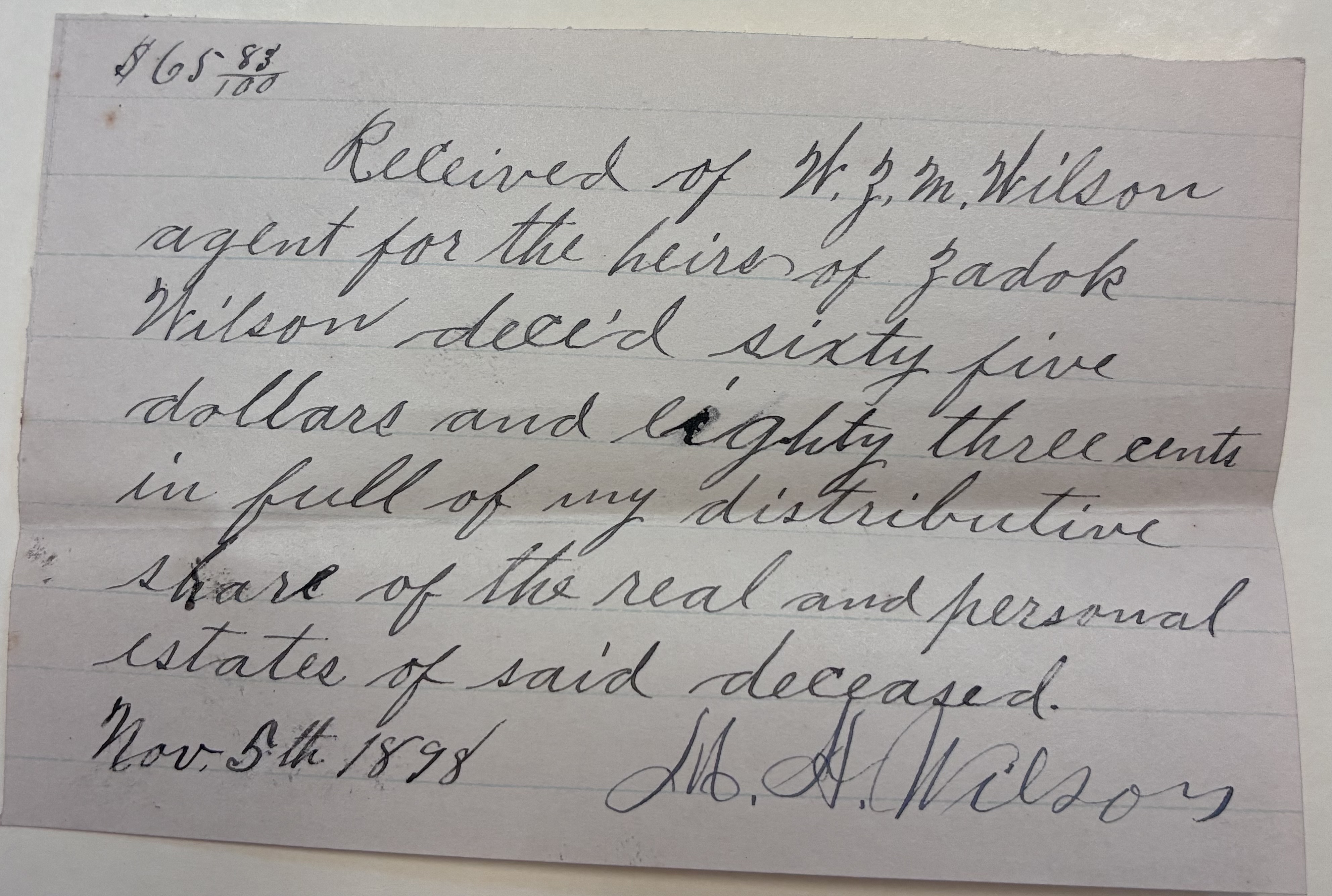 - Receipt from Zadok Estate written by M.H. Wilson, November 5, 1898