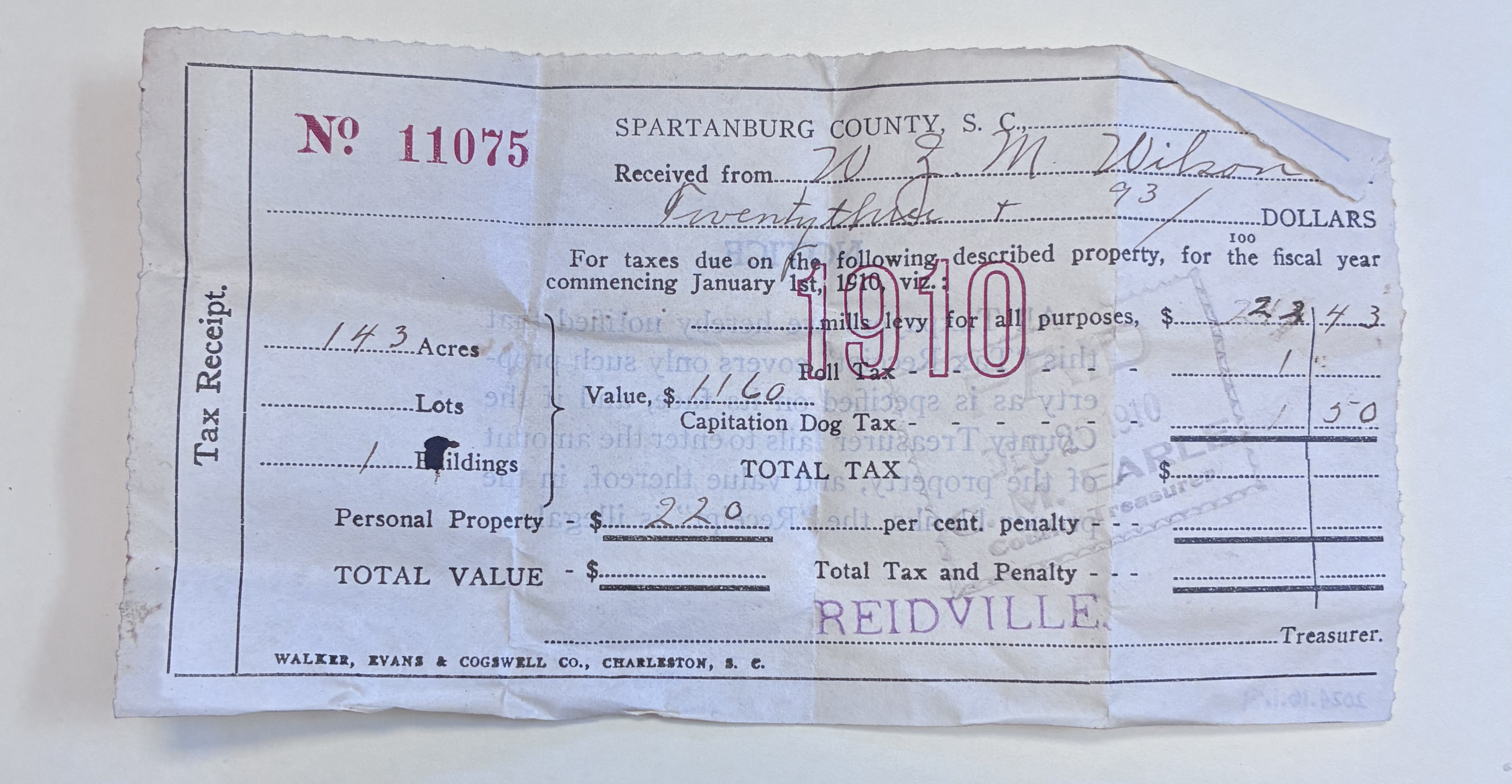 - Tax Receipt from W.Z.M. Wilson, Spartanburg County, S.C., December 25, 1910