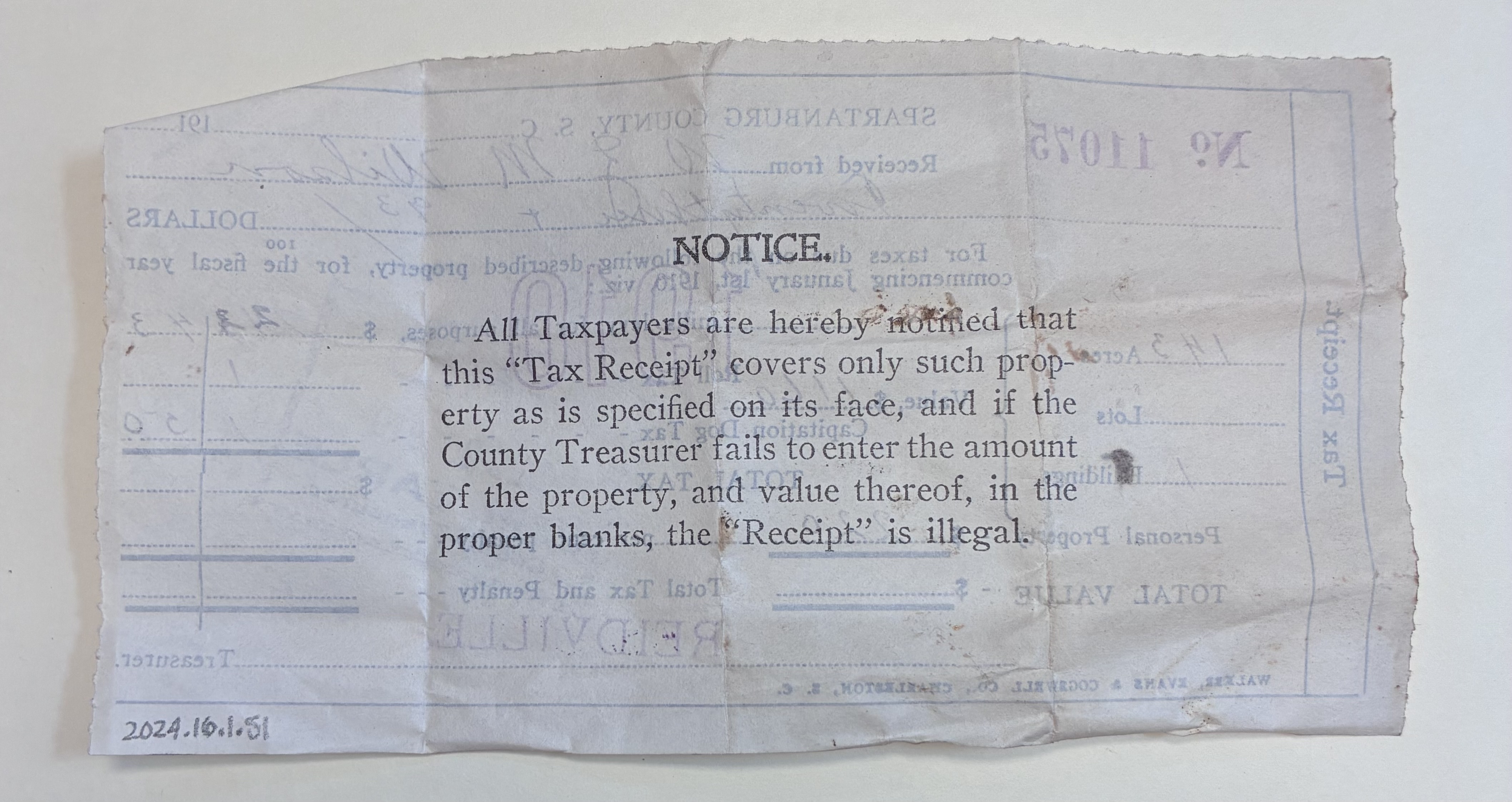 Part of Tax Receipt from W.Z.M. Wilson, Spartanburg County, S.C., December 25, 1910