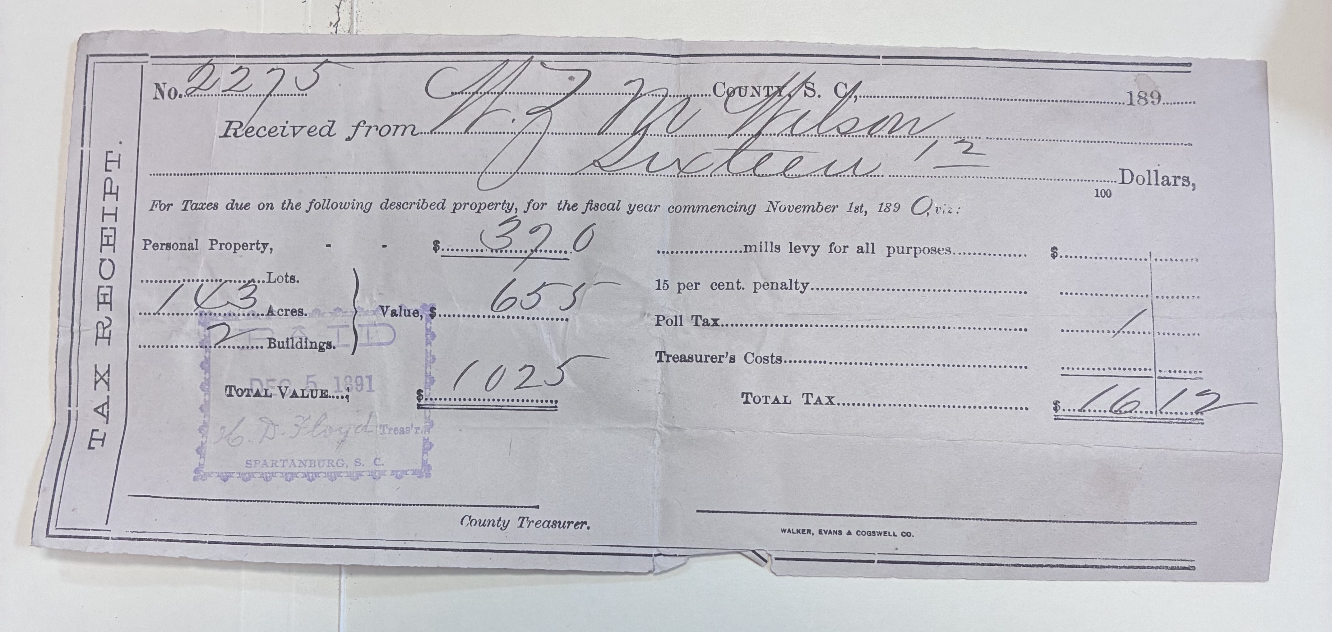 - Tax Receipt from W.Z.M Wilson, Spartanburg, S.C., December 5, 1891