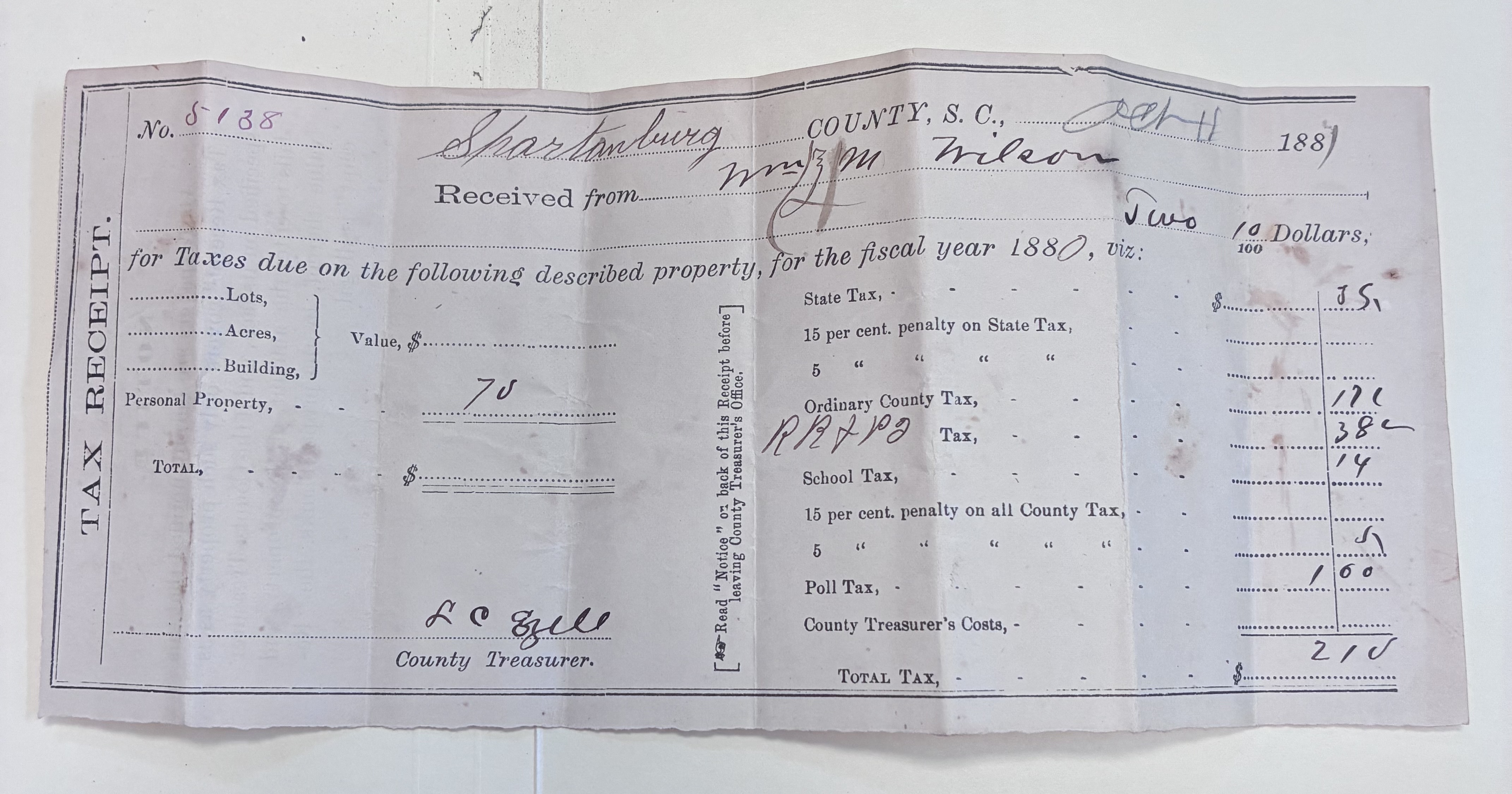 - Tax Receipt from W.Z.M Wilson, Spartanburg, S.C., October 11, 1881