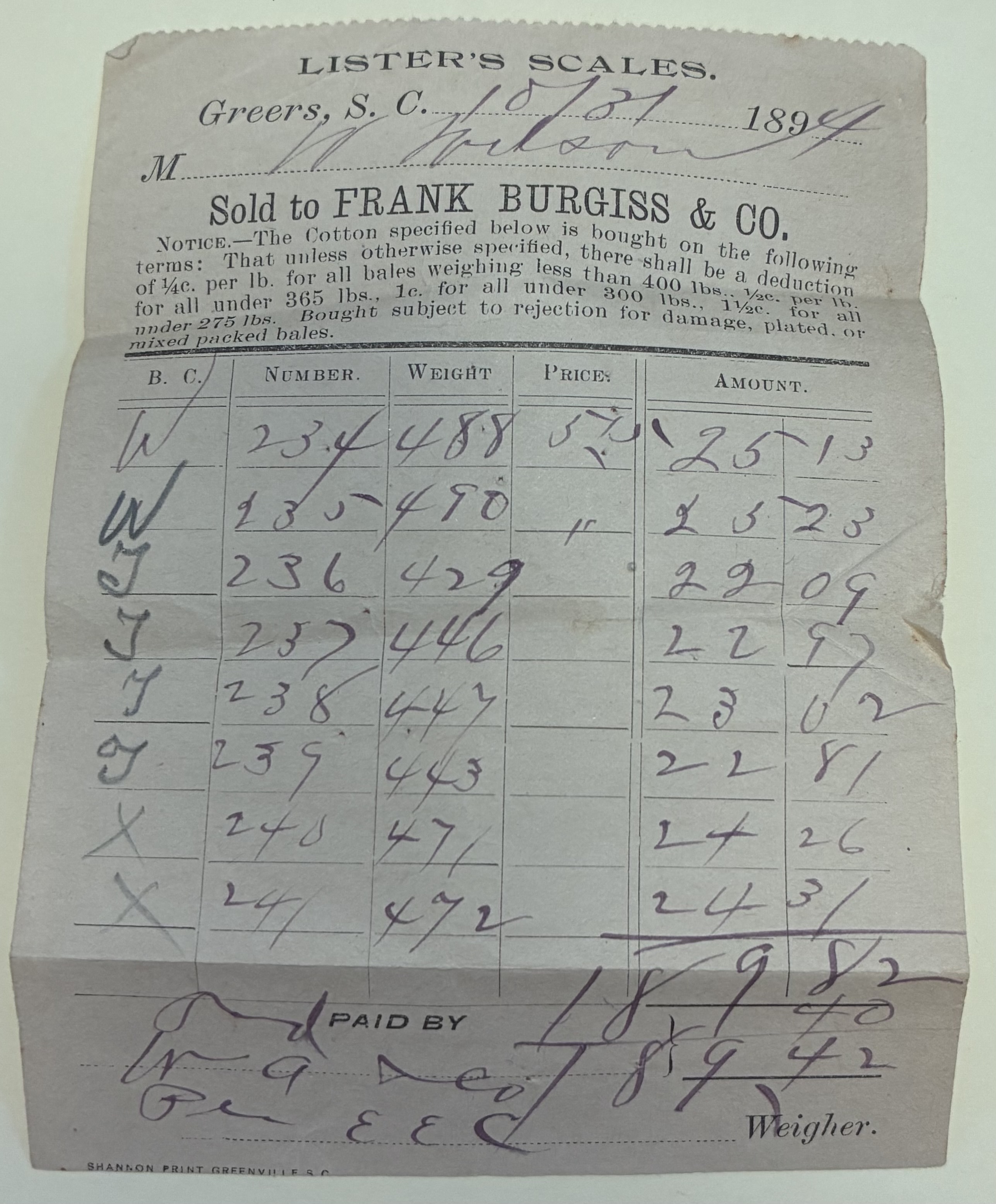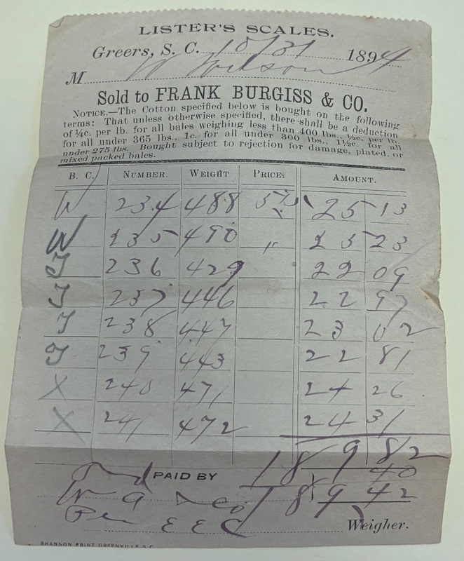 7. Cotton receipt in purple pen from W Wilson sold to Frank Burgiss & Co., Greers, S.C., October 31, 1894