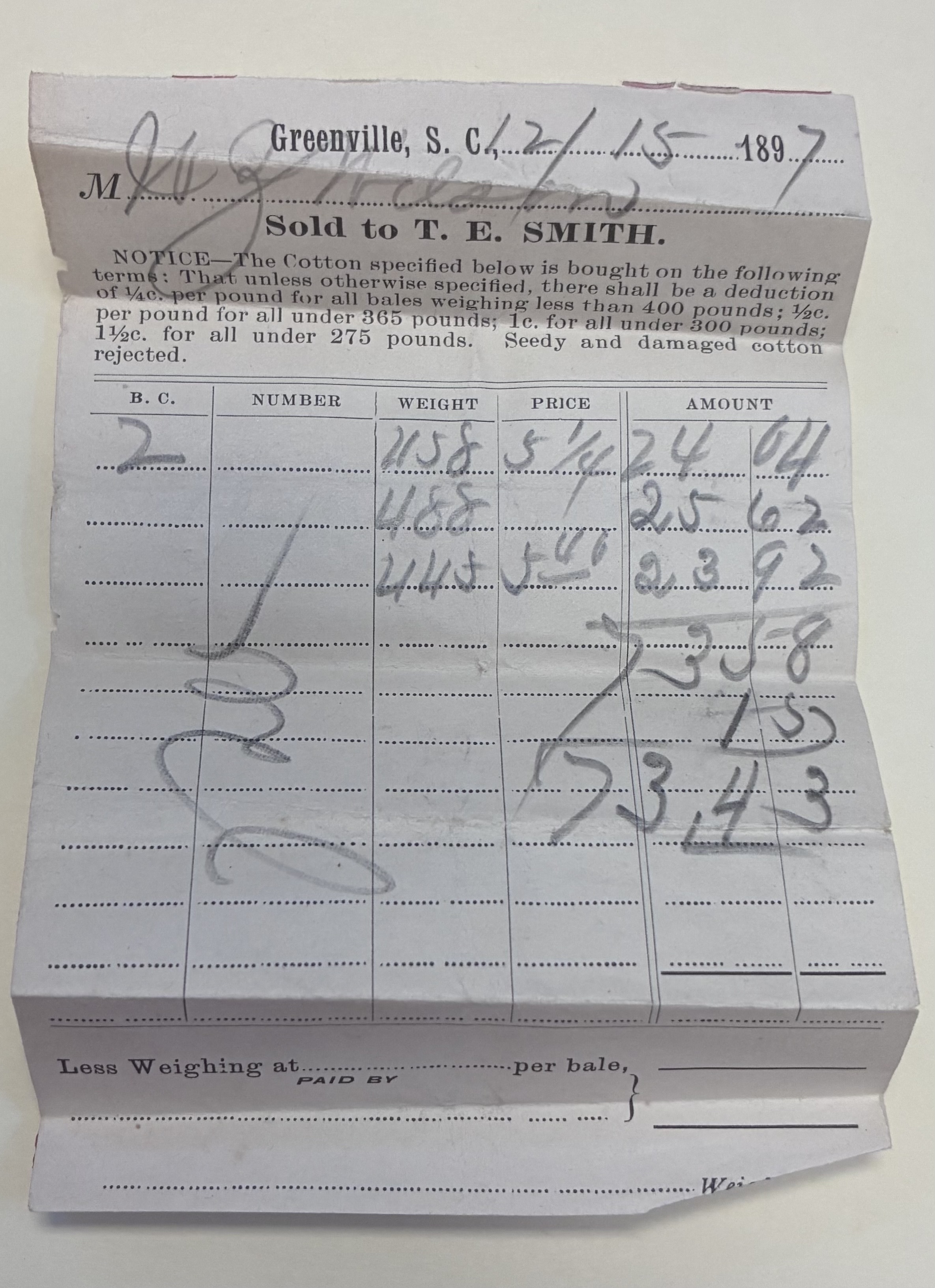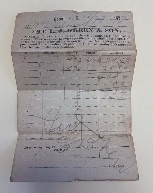 6. Cotton receipt from W.Z. Wilson sold to T.E. Smith, Greenville, S.C., December 15, 1897