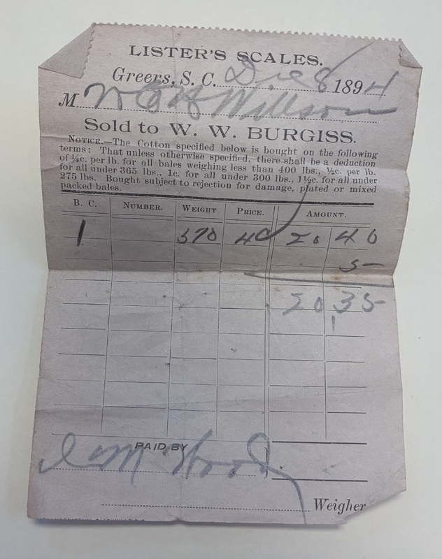 2. Cotton receipt from W.Z.M. Wilson sold to W.W. Burgiss paid by LM Wood, Greers, S.C., December 8, 1894