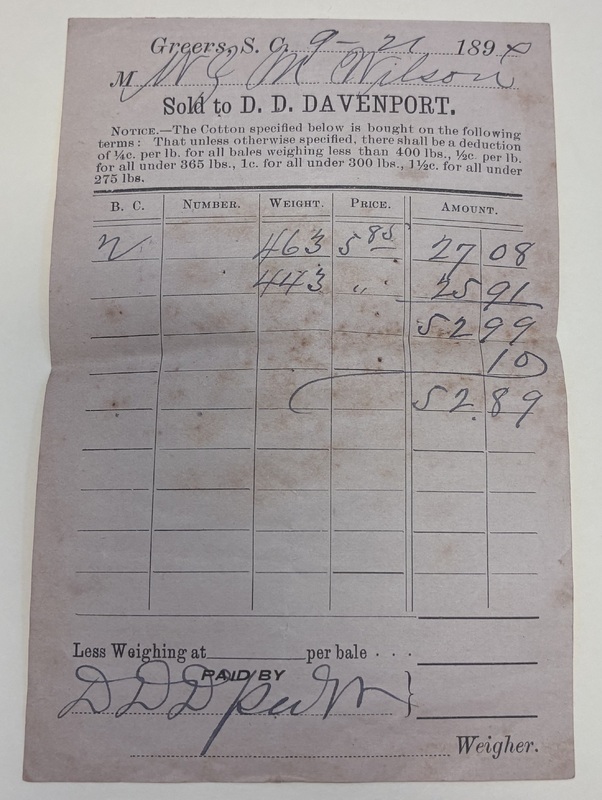 8. Cotton receipt from W.Z.M. Wilson sold and paid by D.D. Davenport, Greers, S.C., September 21, 1890