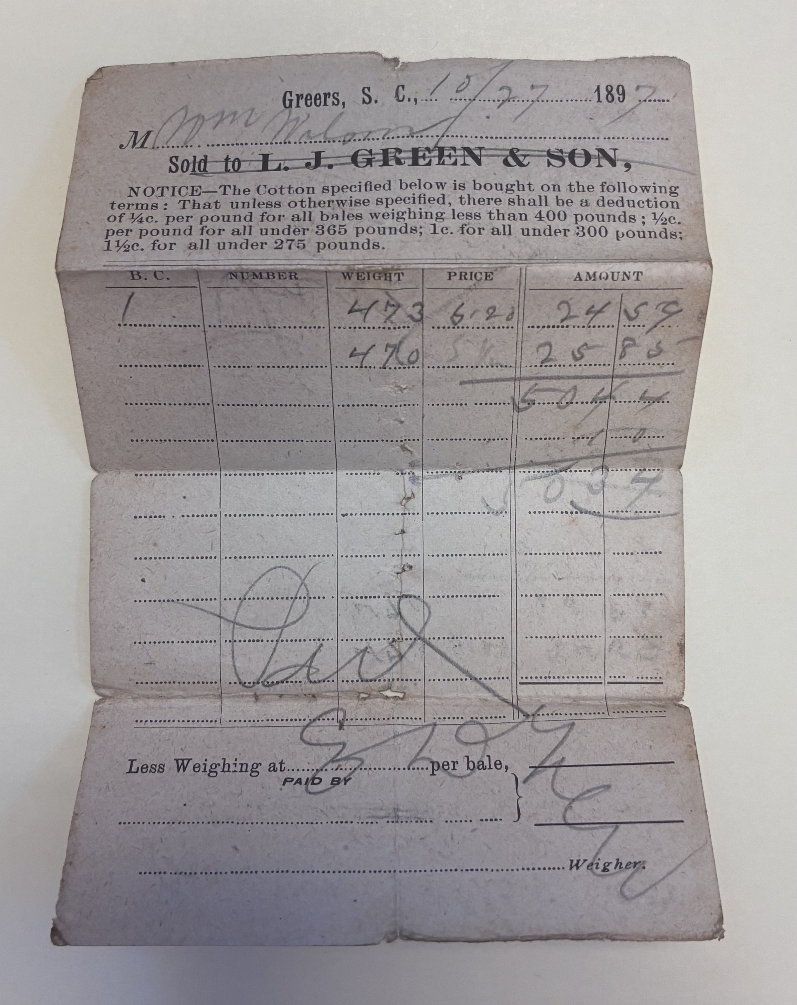 3. Cotton receipt from W.Z.M. Wilson paid by EL Murr, Greers, S.C., October 27, 1897