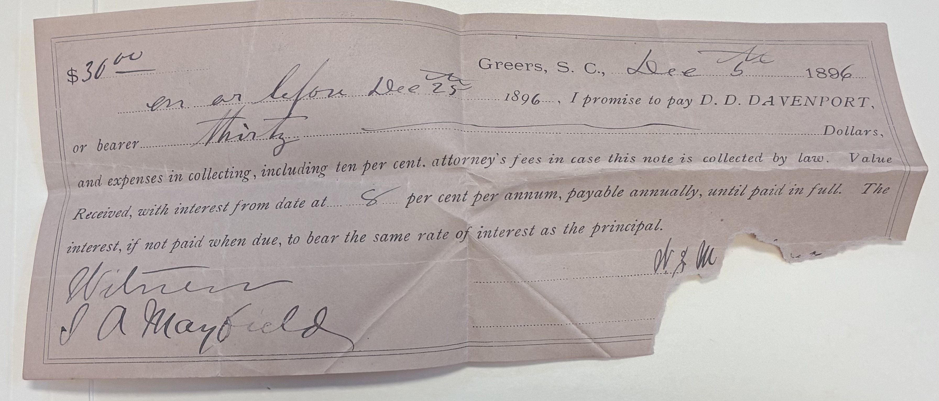 5. Front: Payment promise note to D.D. Davenport from W.Z.M. Wilson, Greers, S.C., December 5, 1896