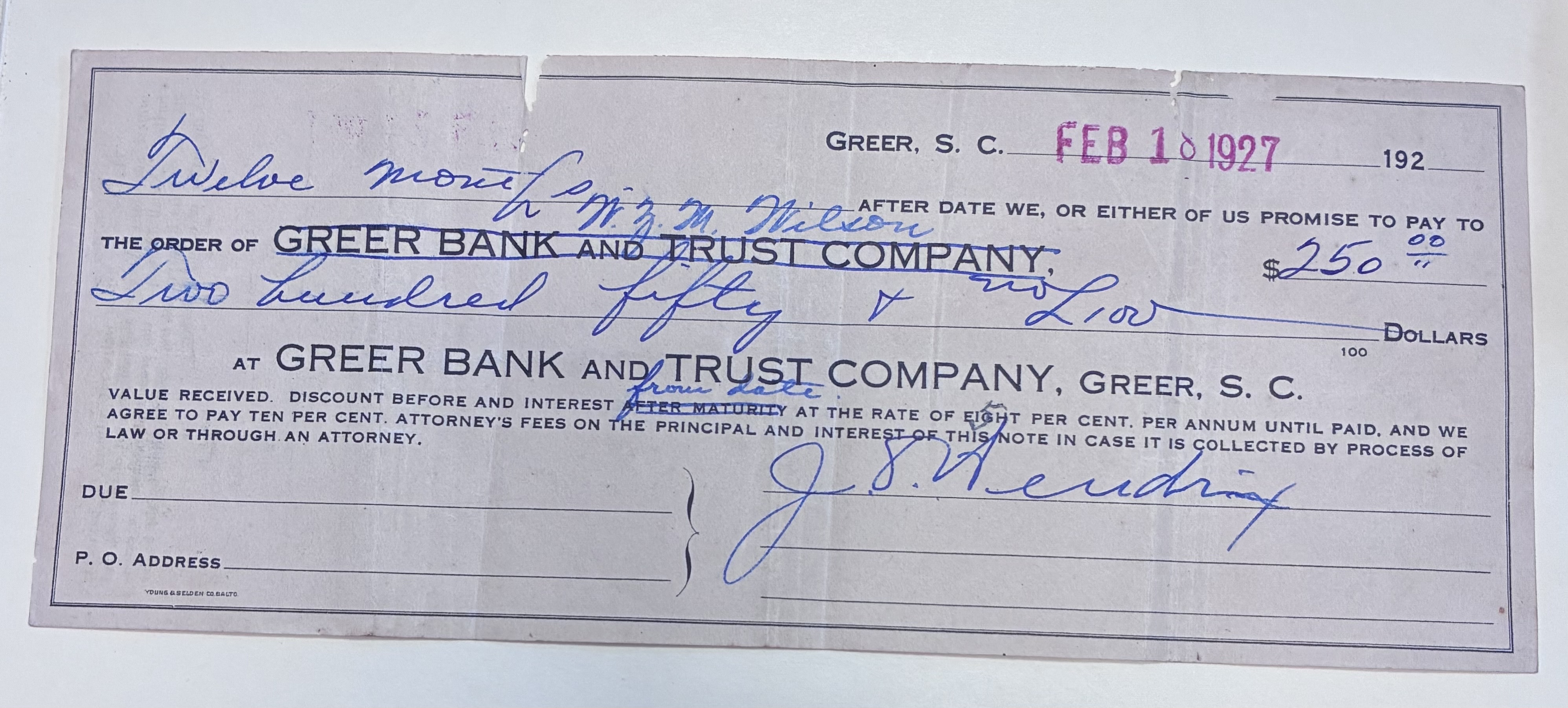 Front: $250.00 Six months after payment order to W.Z.M. Wilson at Greer Bank and Trust Company, Greer, S.C., from J.O Hendrix, February 18, 1927