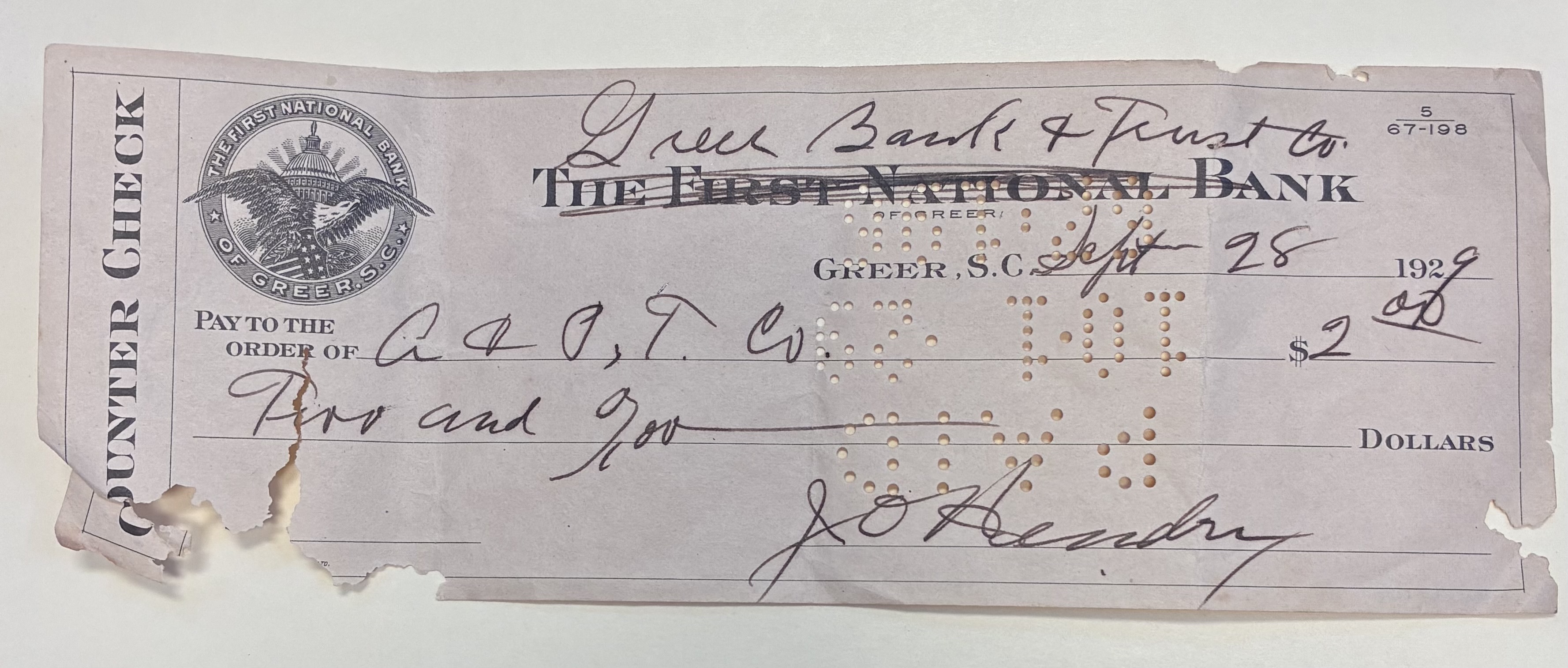 Counter check Greer Bank & Trust Co. $2 to A & P, T. Co from J.O. Hendrix, September 28, 1929