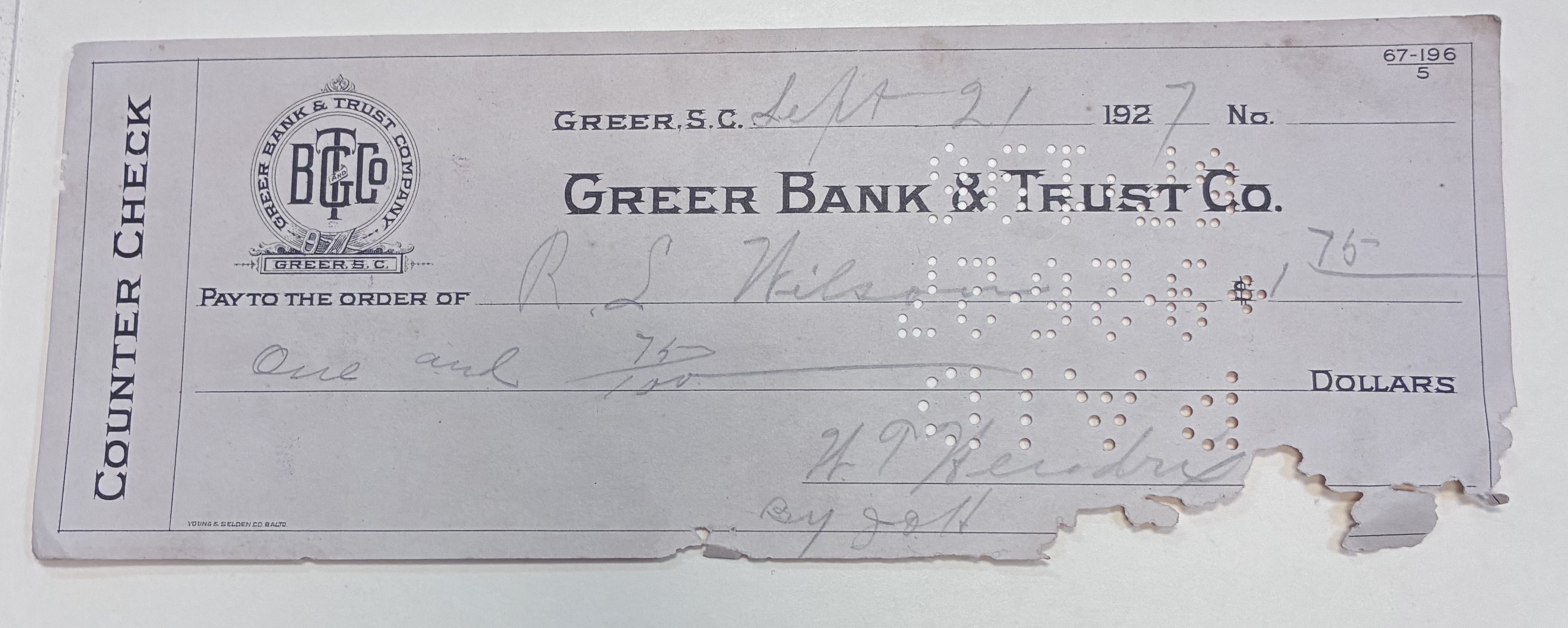Front: Counter check Greer Bank & Trust Co. $1.75 to R.S. Wilson from H.T. Hendrix, September 21, 1927