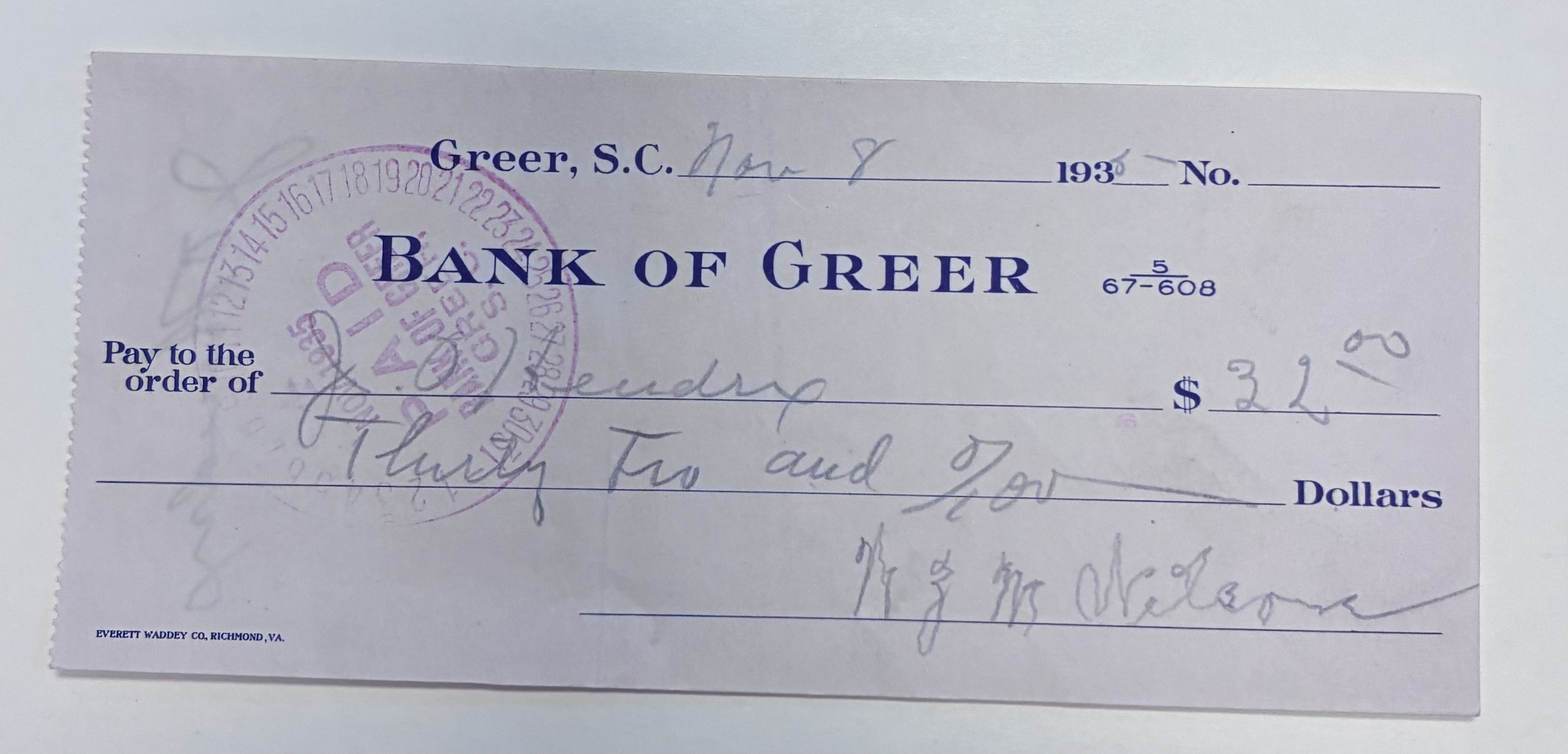 Front: Check Bank of Greer $32 to J.O. Hendrix from W.Z.M. Wilson, Greer, S.C., November 8, 1935
