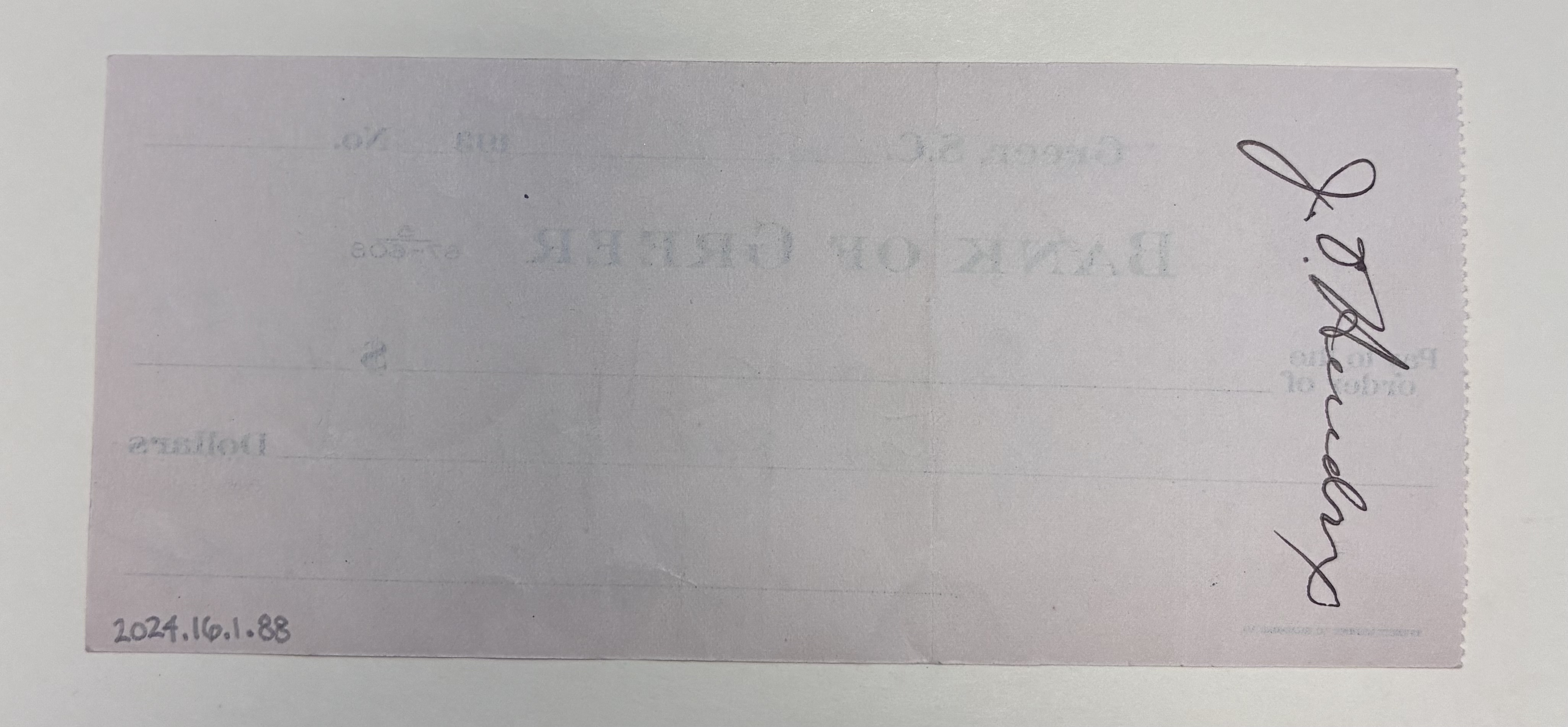 Part of Check from W.Z.M. Wilson to J.O. Hendrix, Greer, S.C., November 8, 1935