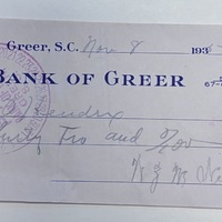 - Check from W.Z.M. Wilson to J.O. Hendrix, Greer, S.C., November 8, 1935