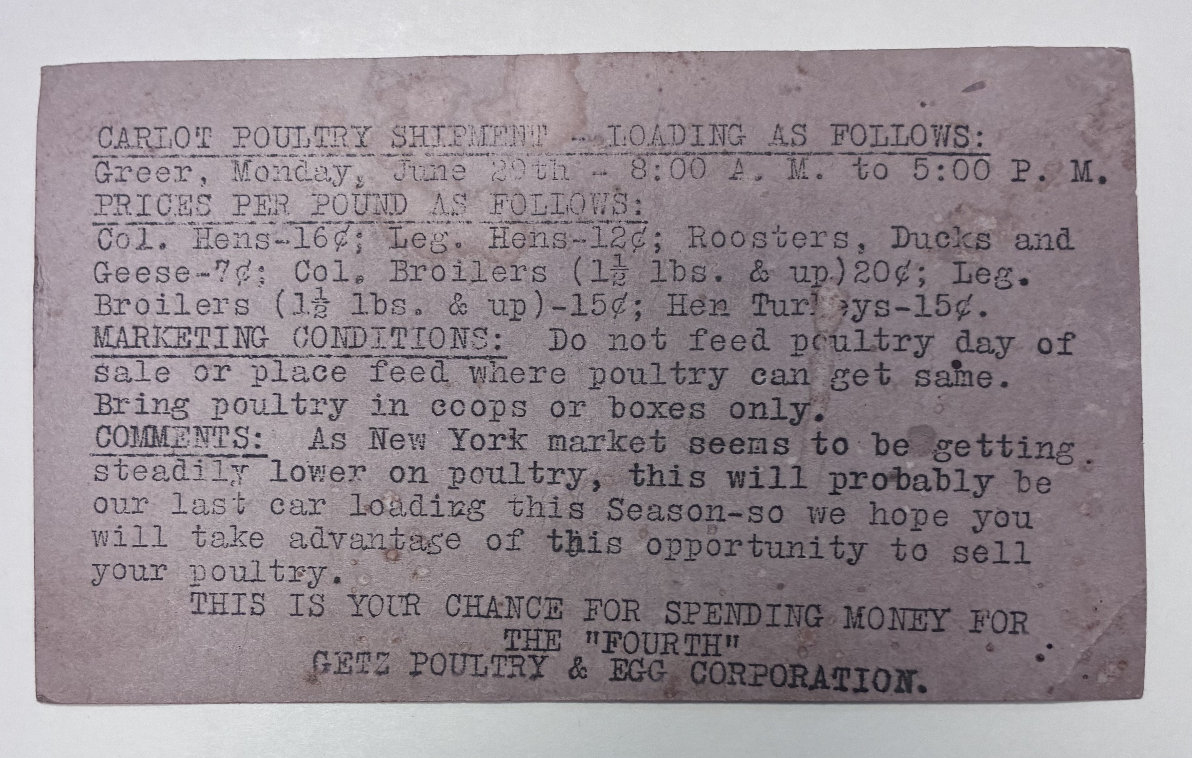 COMMENTS: As New York market seems to be getting steadily lower on poultry, this will probably be our last car loading this Season-so we hope you will take advantage of this opportunity to sell your poultry.