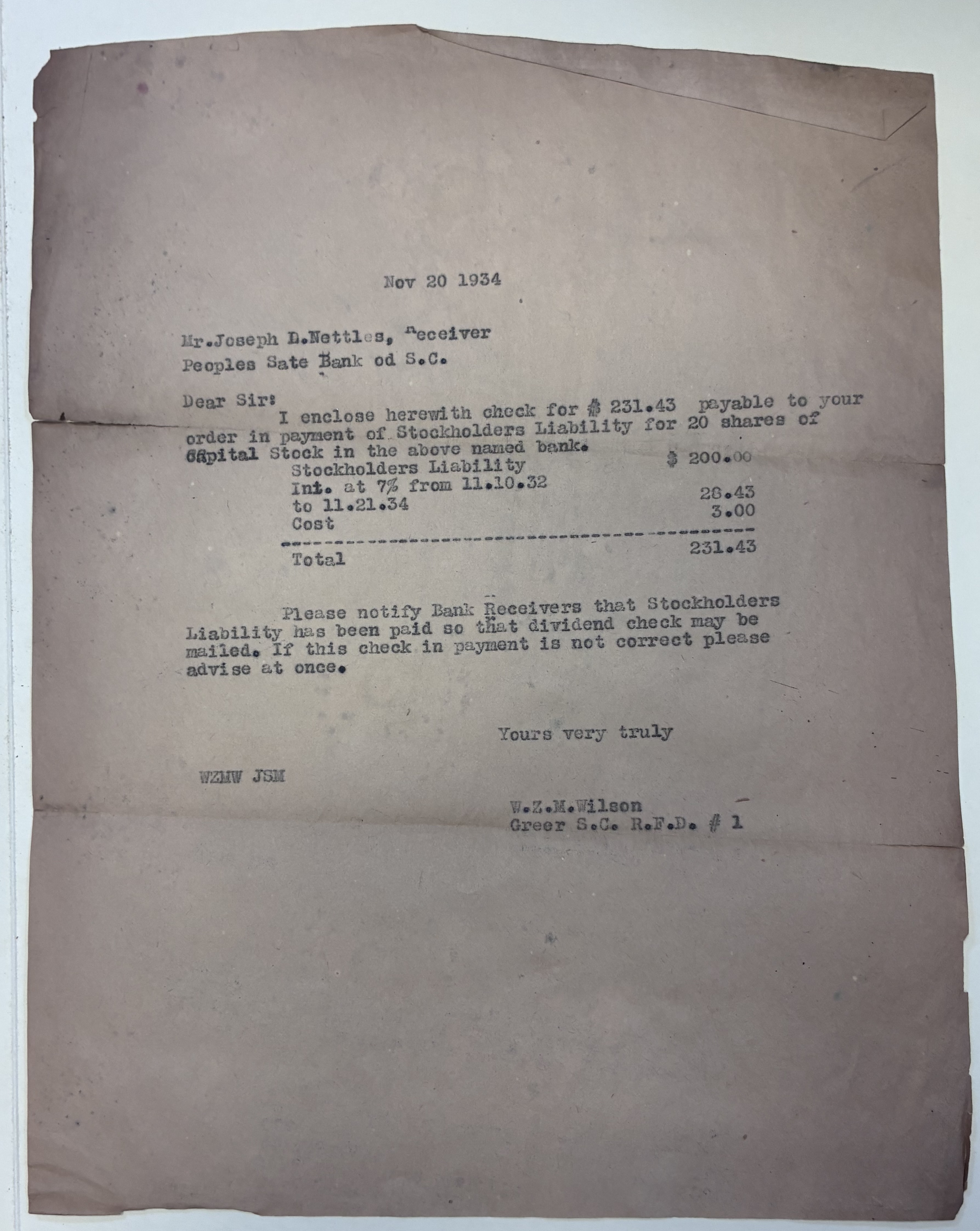 - Typed letter enclosing check $231.43 payment of Stockholders Liability from W.Z.M. Wilson for Peoples State Bank of S.C., November 20, 1934